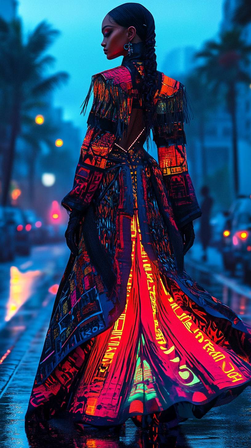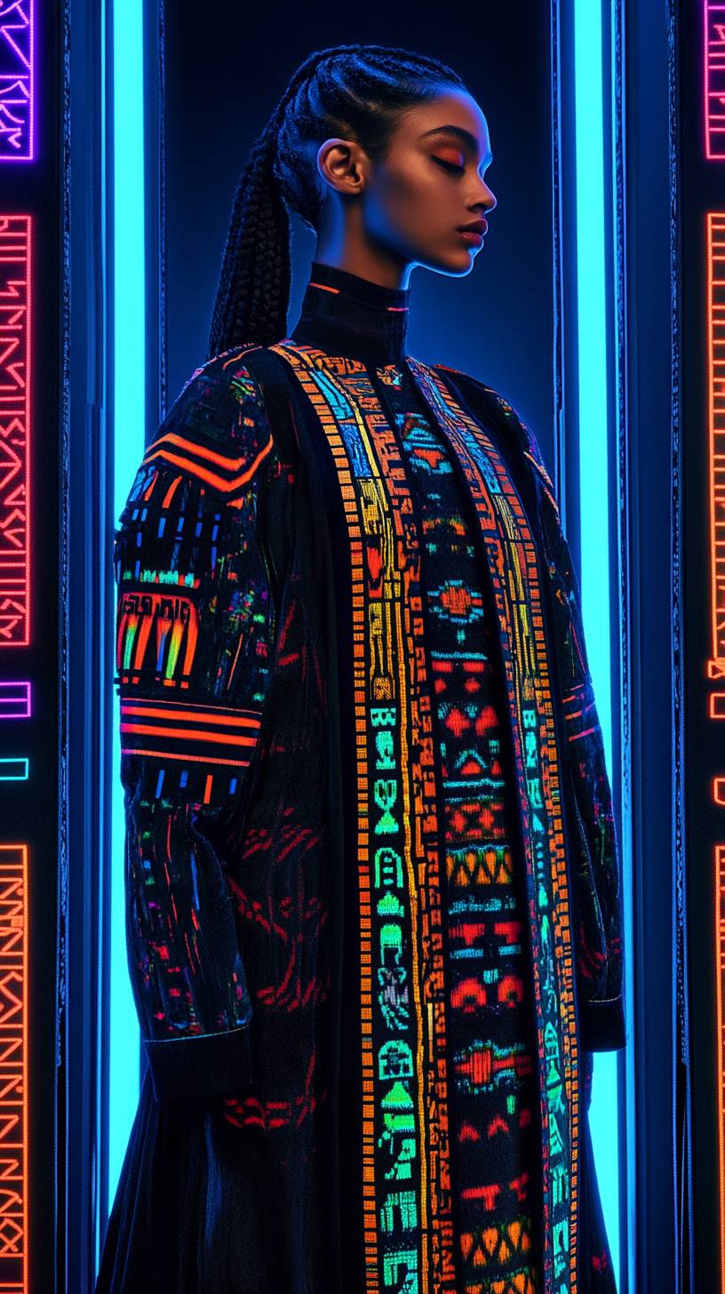 An evocative fashion scene where the ancient rites of unknown civilizations meet the edge of contemporary fashion. The model wears a garment that is both armor and gown, with patterns echoing the glyphs of a forgotten language. The colors are deep and resonant, with flashes of neon that pulse like the heartbeat of an unseen world. Her posture is regal, embodying both warrior and priestess, as the setting merges the organic forms of a jungle temple with the stark lines of modernist design. The result is a visual enigma, at once timeless and trailblazing. --chaos 10 --ar 9:16 --style raw --personalize 3qqn4hq --stylize 200 --v 6.1