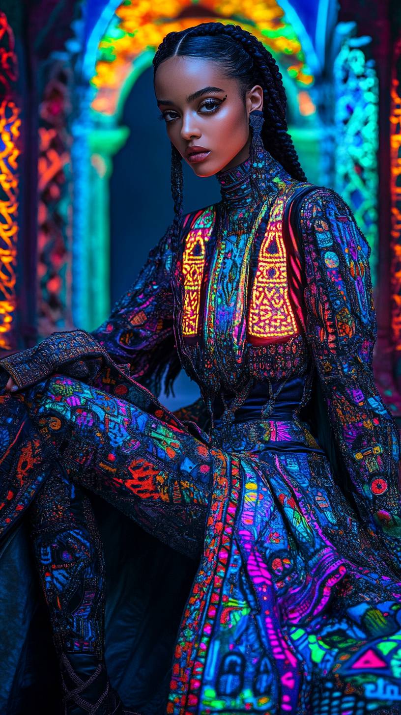 An evocative fashion scene where the ancient rites of unknown civilizations meet the edge of contemporary fashion. The model wears a garment that is both armor and gown, with patterns echoing the glyphs of a forgotten language. The colors are deep and resonant, with flashes of neon that pulse like the heartbeat of an unseen world. Her posture is regal, embodying both warrior and priestess, as the setting merges the organic forms of a jungle temple with the stark lines of modernist design. The result is a visual enigma, at once timeless and trailblazing.