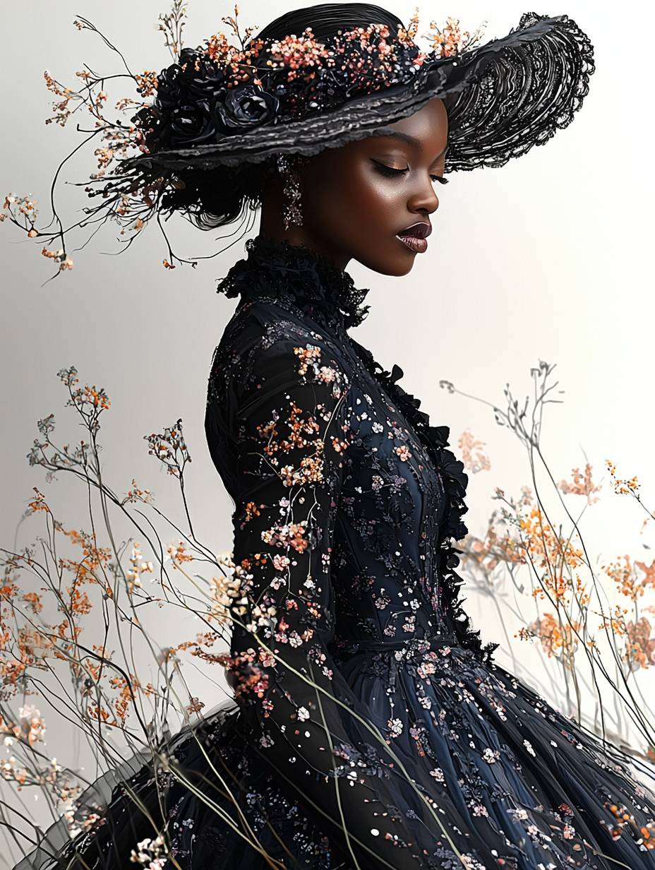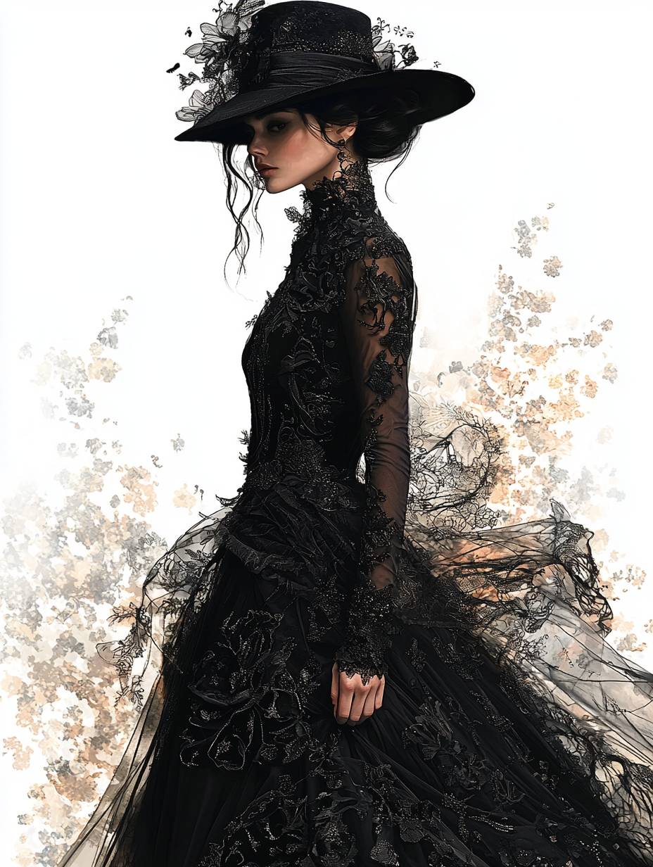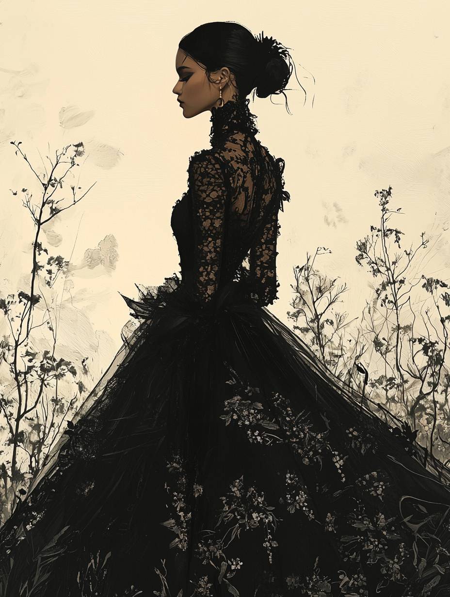 A high-fashion illustration inspired by Nina Ricci’s romantic couture collections, blending classical elegance with a modern twist. The image should feature intricate details, soft silhouettes, and a sense of refined luxury. --v 6.1 --ar 3:4 --stylize 800 --q 2