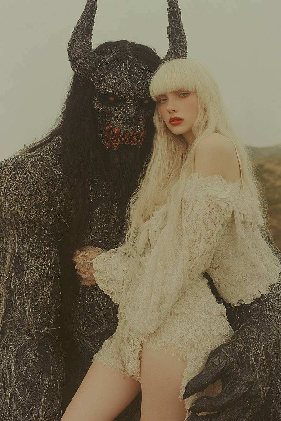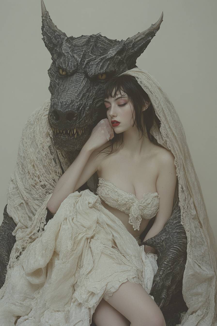 Catalog editorial, Monster and girl with beige and grey tones --seed 152748173 --personalize qnxljcx --stylize 800 --v 6.1 --ar 2:3