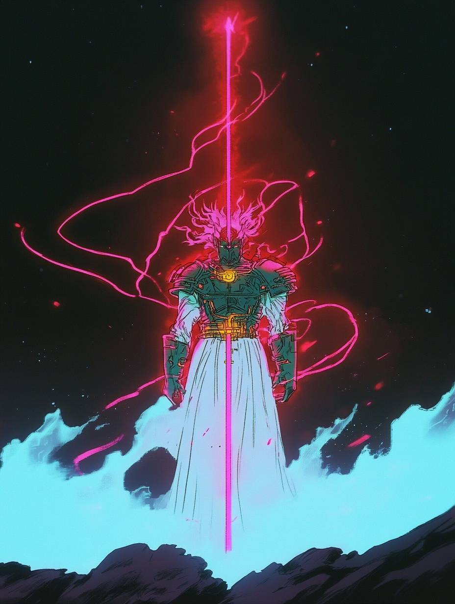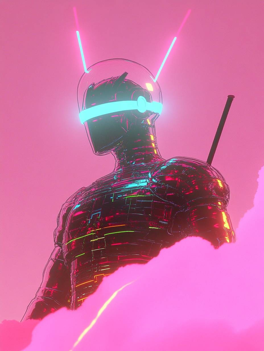 Tech-enhanced warrior with translucent armor revealing circuitry