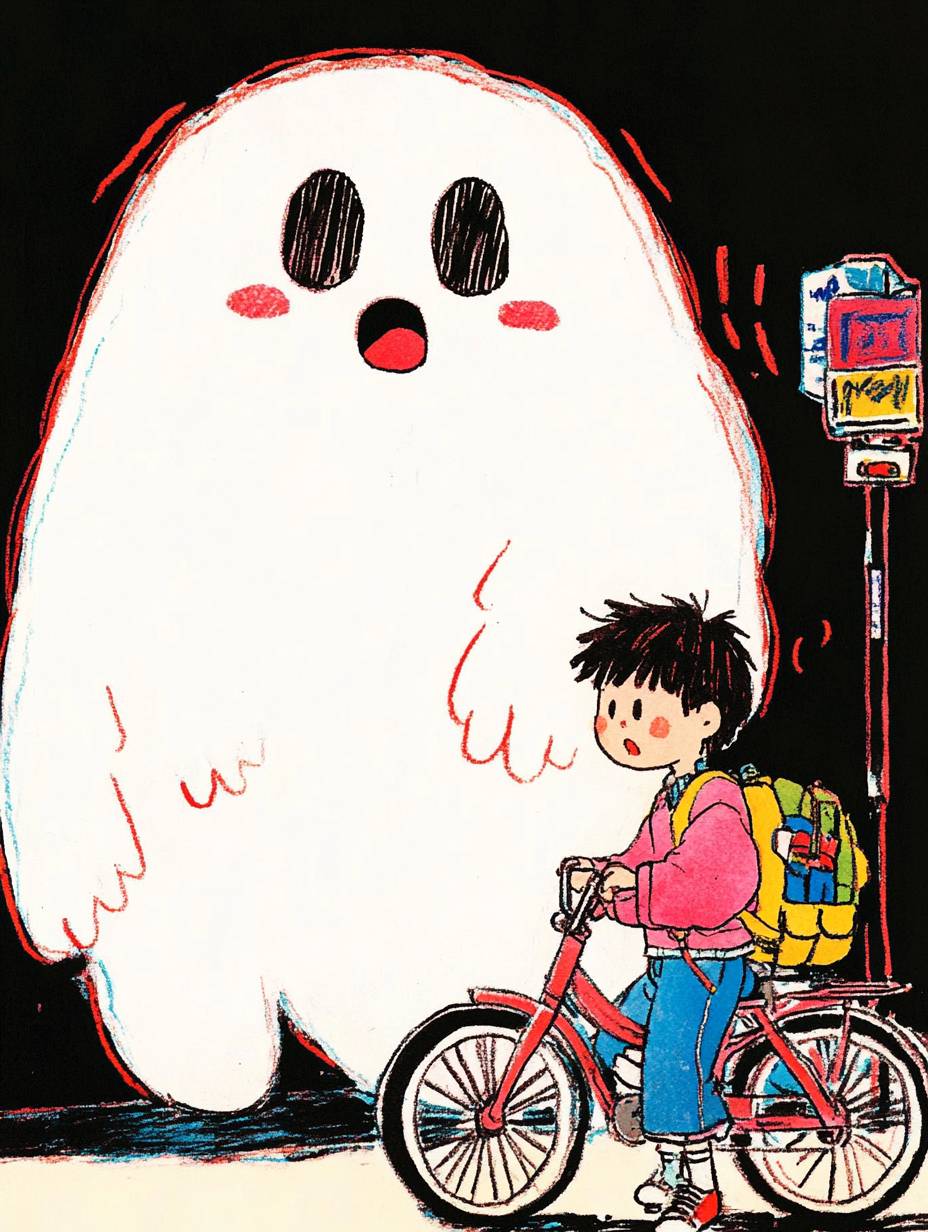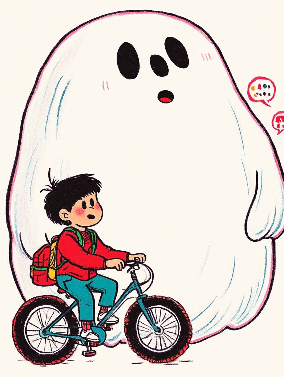 whimsical illustration of a boy on a bicycle accompanied by a large, translucent ghost-like creature looming protectively behind, childlike wonder, urban setting, supernatural companionship, imagination, soft watercolor textures, subtle glow around ghost, perspective distortion, dreamy pastel atmosphere, thought bubbles, invisible bonds, --ar 3:4 --style raw --sref 2662881429 --personalize rd9y55c --v 6.1
