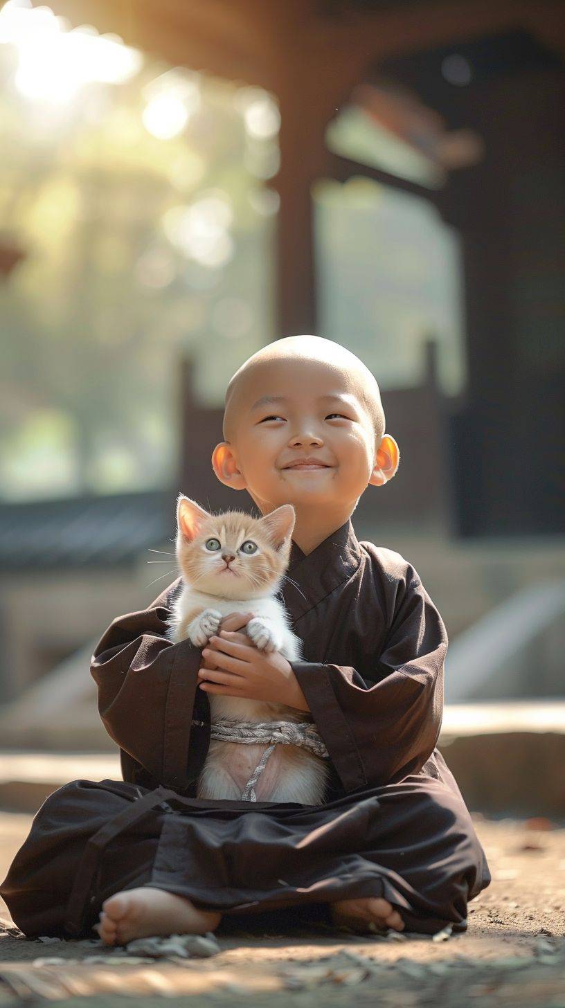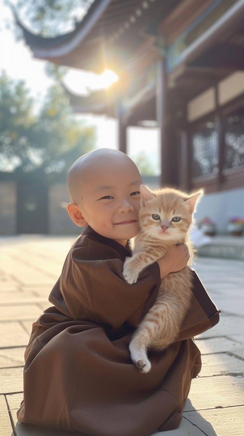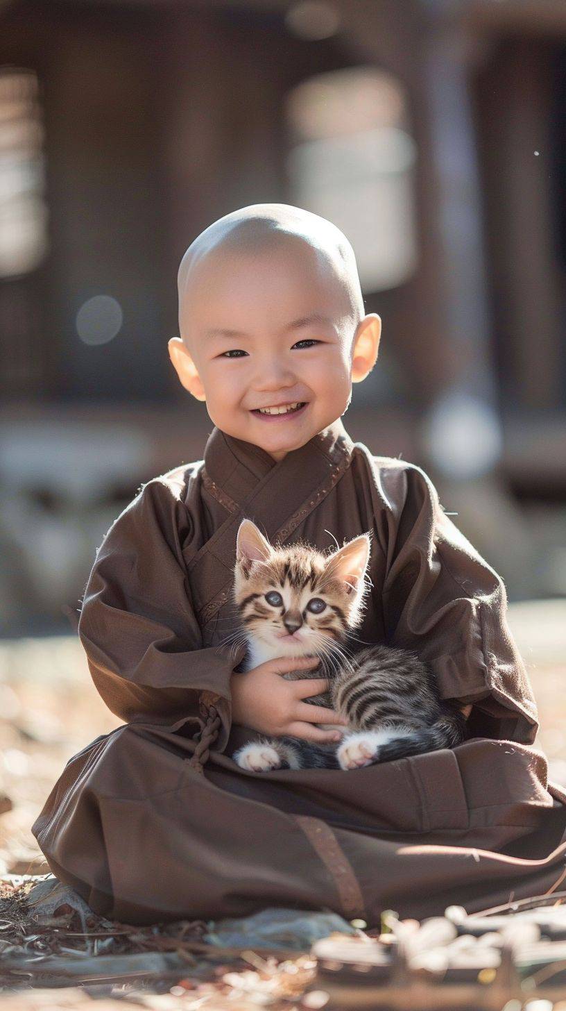 On a sunny morning, a 3-year-old cute bald Chinese monk with big eyes, dark brown Buddhist robe, white and chubby, sitting cross-legged with a smiling face, holding a cute kitten in his arms, sitting outdoors in the sunshine, facing forward, a real photo, the sun shining on his face --style raw --ar 9:16