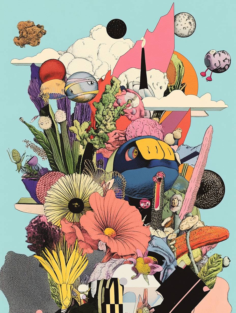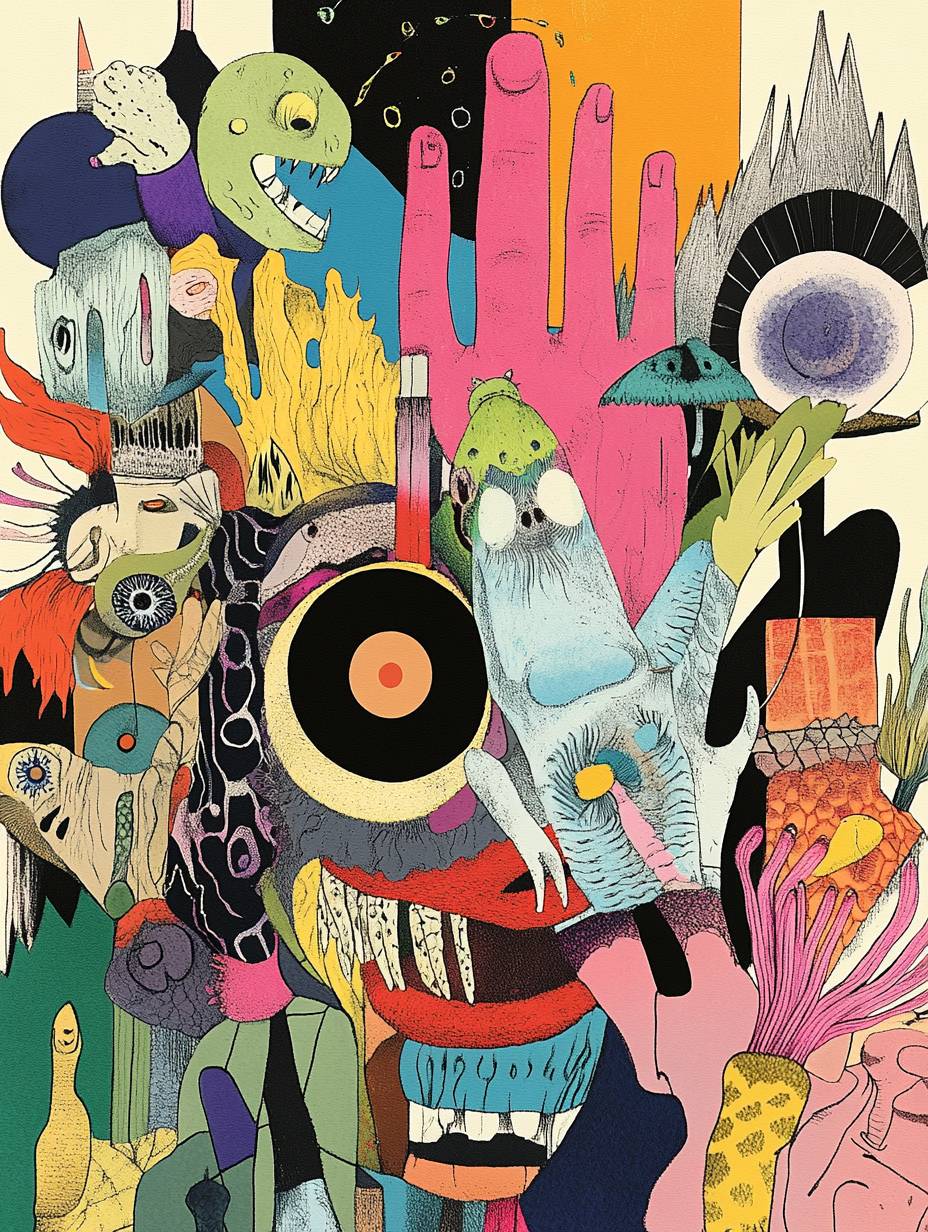 psychedelic cartoon wonderland teeming with bizarre creatures, abstract plantlife, and surreal objects in explosively colorful composition, interdimensional ecosystem, visual synesthesia, animated chaos, mind-bending carnival, reality-melting transitions, color-shifting auras, fractal growth patterns, euphoric technicolor atmosphere, neural networks, quantum foam, oversaturated vibrant exposure, --ar 3:4 --style raw --sref 2891286374 4024216672 --personalize rd9y55c --v 6.1