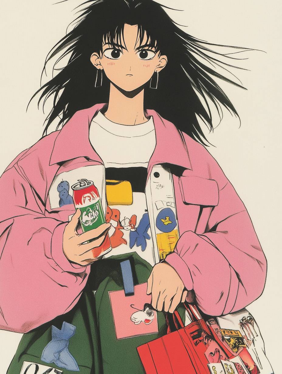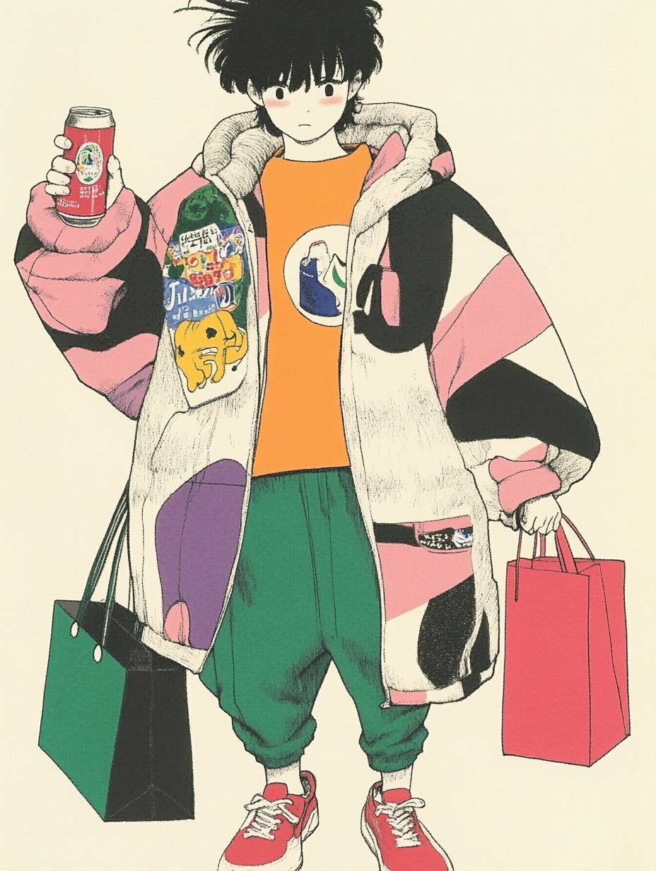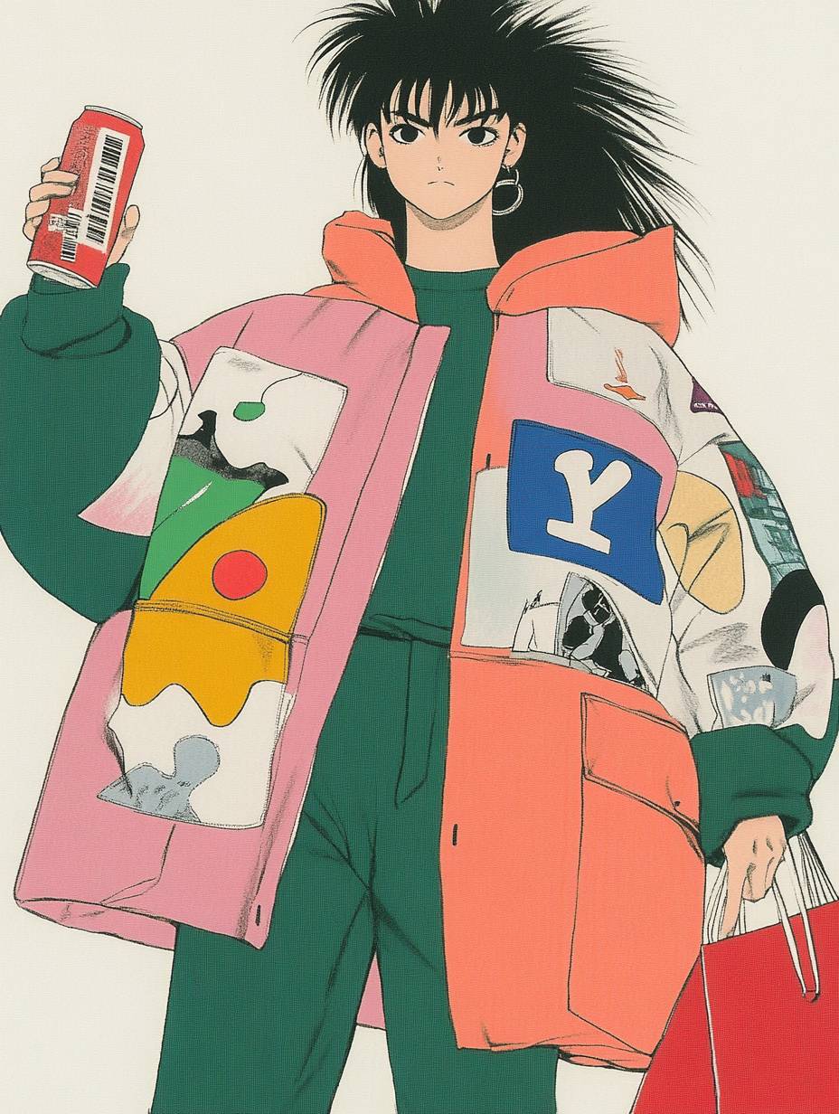 stylized anime character in urban streetwear, holding soda can, wearing oversized jacket covered in cute cartoon patches and stickers, messy black hair, red sneakers, shopping bags, urban youth, high contrast exposure, dominated by teal tones, close-up shot focusing on characters accessories and clothing details, --ar 3:4 --style raw --sref 680572301 2720653134 315310843 --personalize rd9y55c --v 6.1