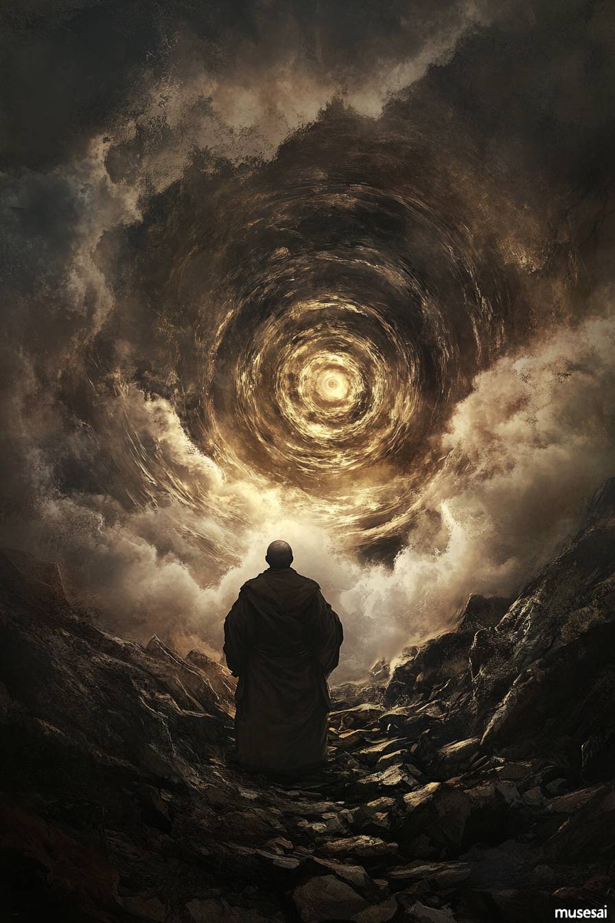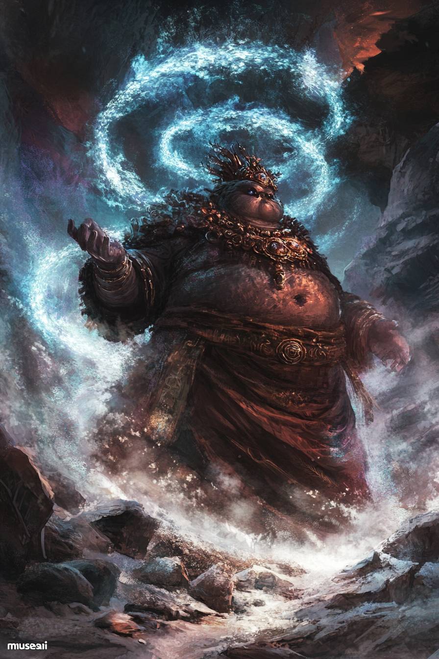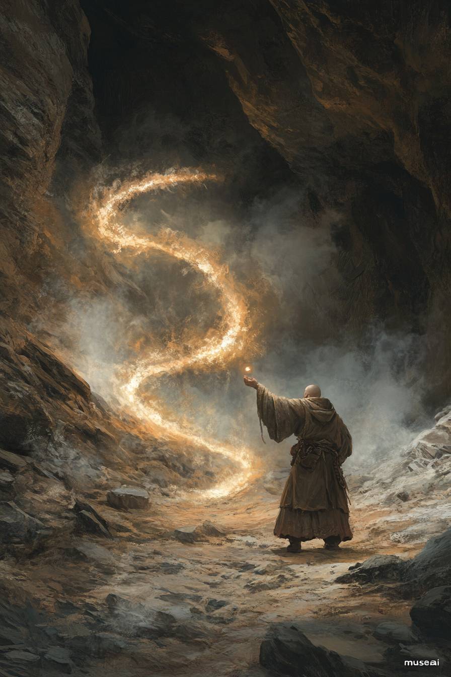 A mystical scene of a bulbous priest tapping into the Zynysphere, the magical energy beneath the earth's surface. Steam-like energy rises from the ground, forming a spiral. The rotund priest, wearing a robe and a headdress, stands on a rocky terrain. The background reveals a dark, cavernous structure. "musesai" --v 6.1 --ar 2:3