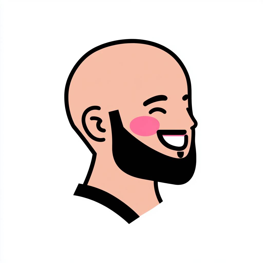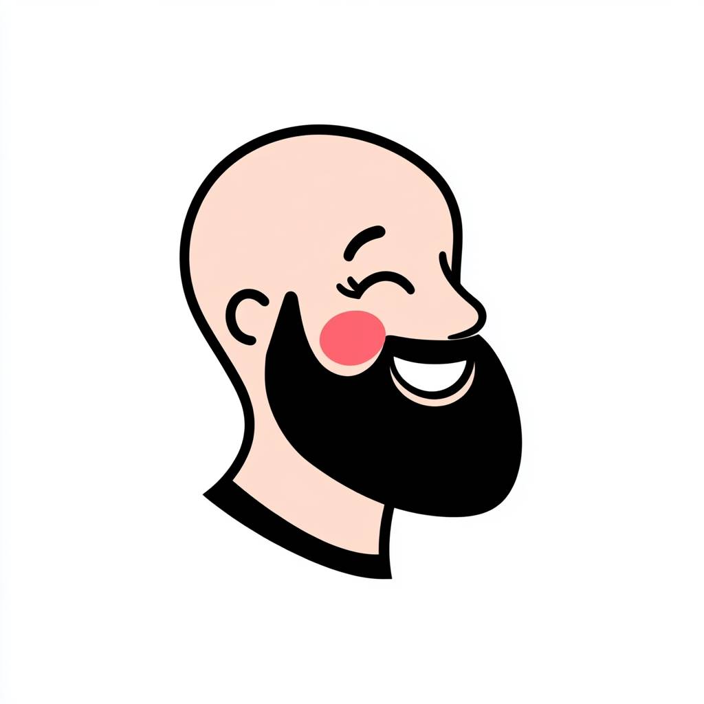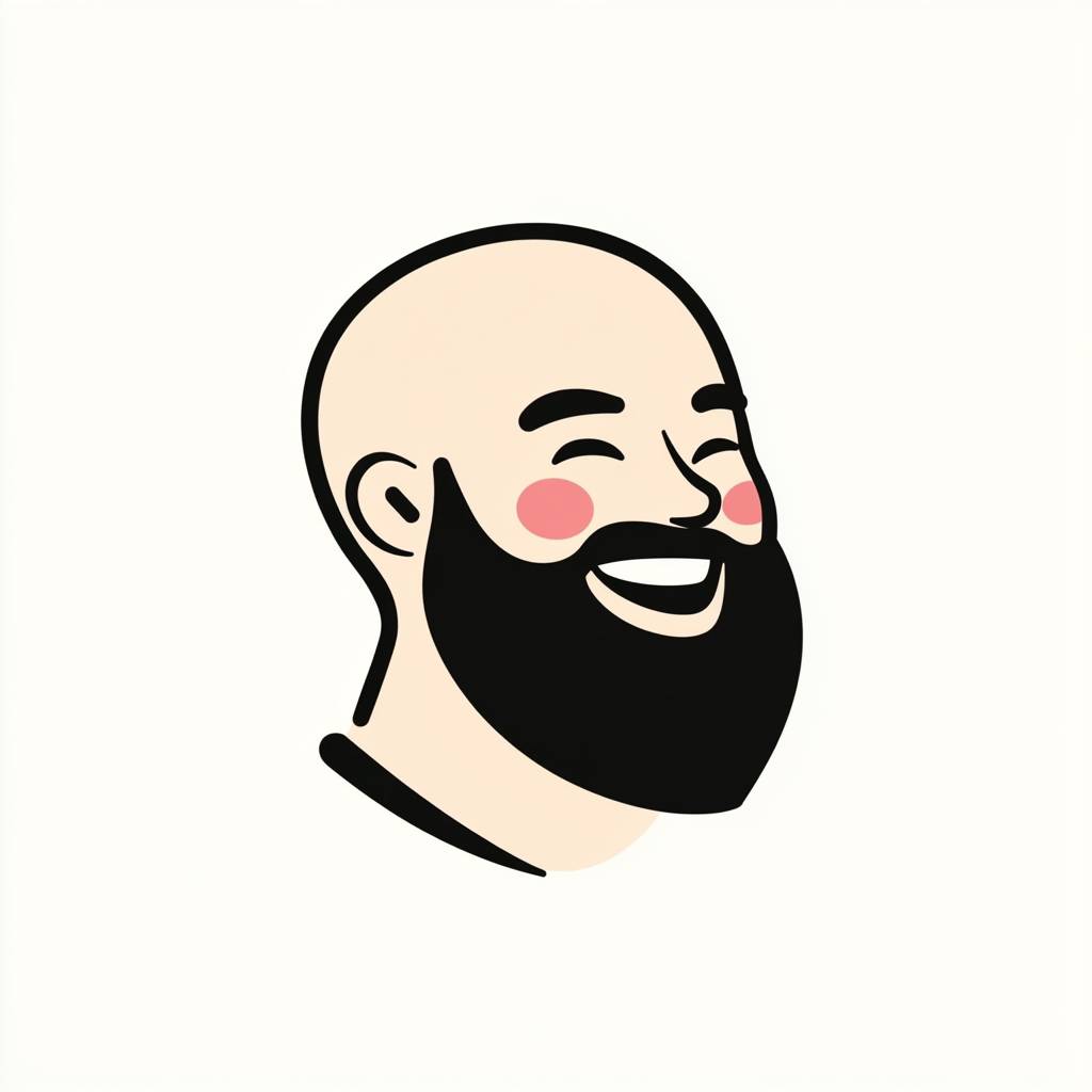 A simple, minimal vector logo of a bald man with a beard, in profile, happy and smiling, with pink cheeks and a black beard, on a white background, in the style of Rherdyne Uroscinica.
