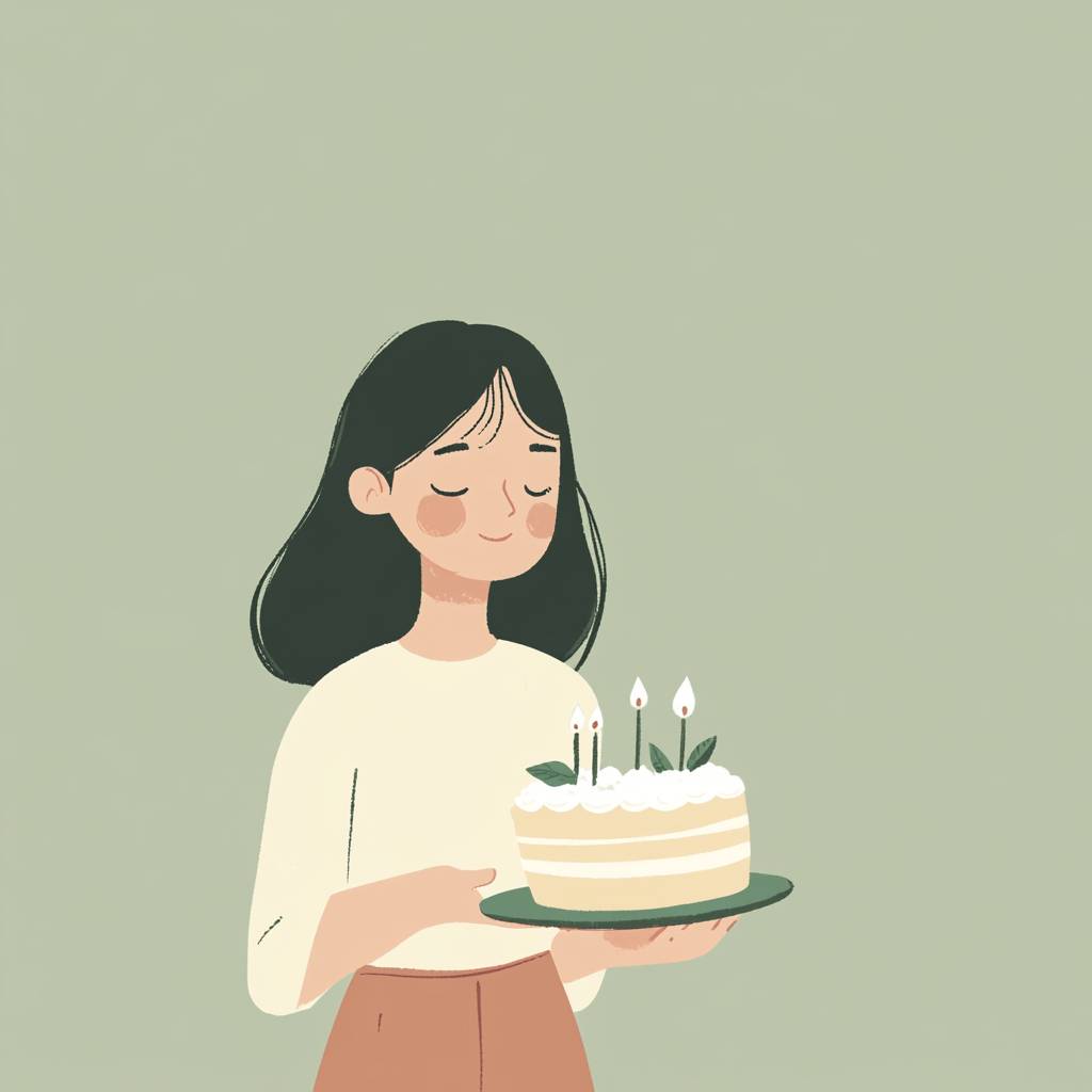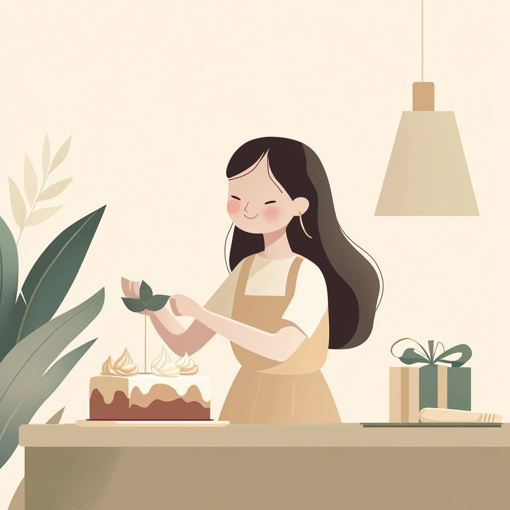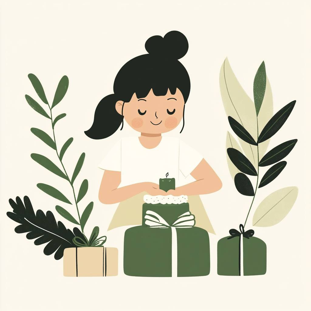 a cute girls,making some present,smile,open eyes,celebrate birthday,have a birthday cake ,in the style of dark white and light green, minimalist graphic designer, animated gifs, light beige, soft and rounded forms, grocery art, creative commons attribution --ar 1:1 --v 6.1
