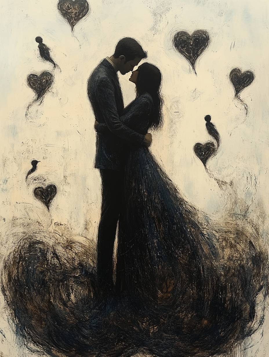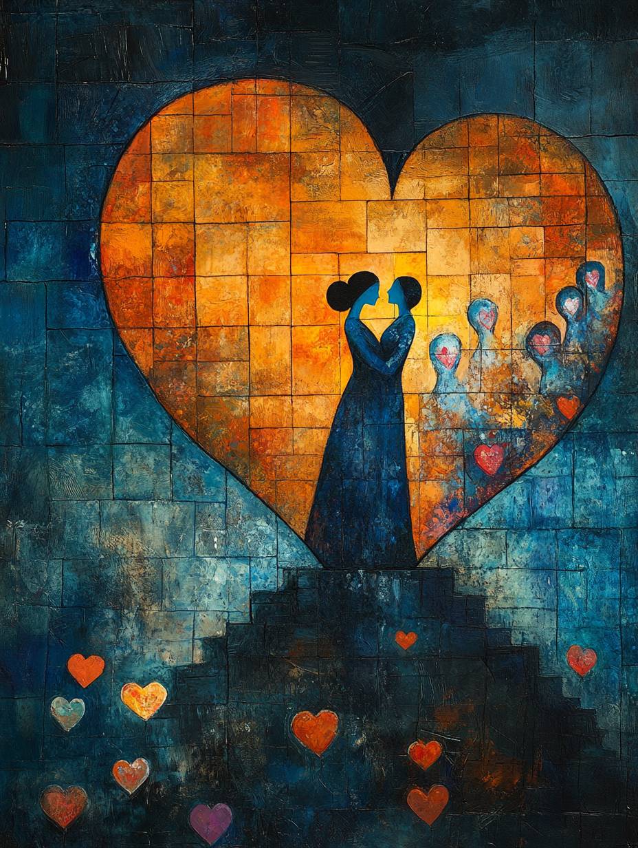A modern interpretation of love’s embrace, combining Gustav Klimt’s detailed, ornate patterns with Marc Chagall’s whimsical, floating figures. The artwork should convey the idea that love transcends time and space, linking hearts across different dimensions.