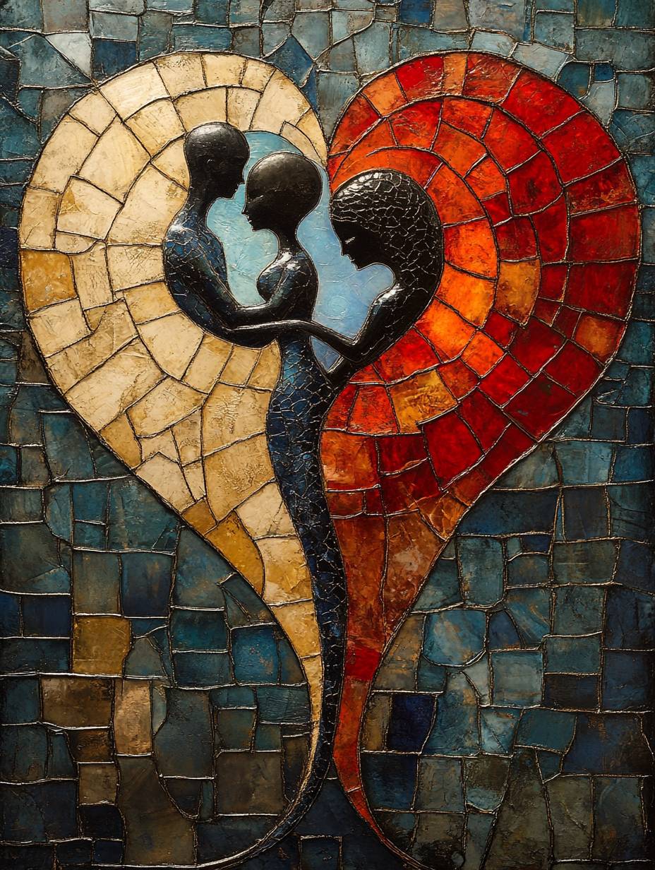 A modern interpretation of love’s embrace, combining Gustav Klimt’s detailed, ornate patterns with Marc Chagall’s whimsical, floating figures. The artwork should convey the idea that love transcends time and space, linking hearts across different dimensions. --v 6.1 --ar 3:4 --stylize 800