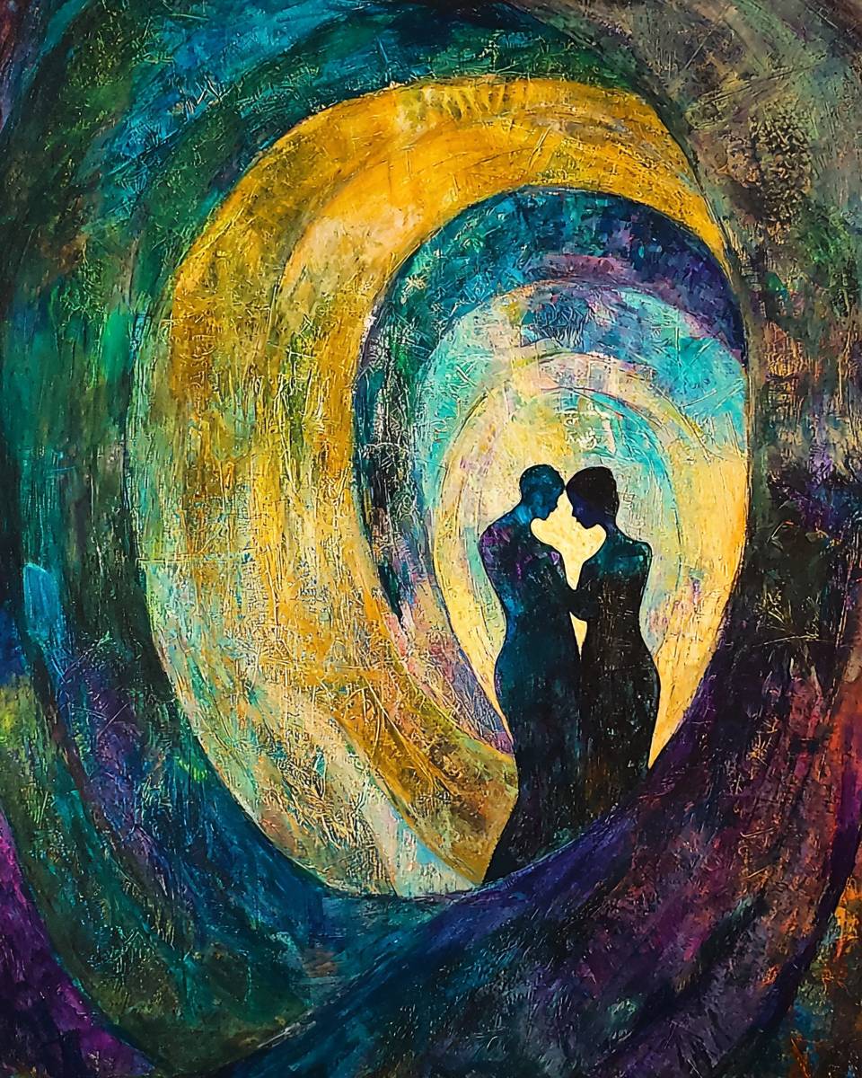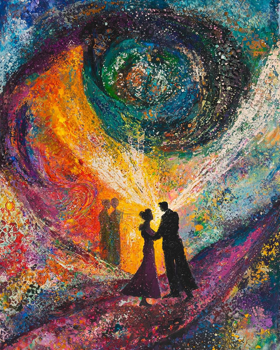A vibrant, expressionistic scene inspired by Marc Chagall and Gustav Klimt, where figures are connected by beams of light, symbolizing the bonds of love. The image should use rich colors, swirling patterns, and a sense of movement to evoke the powerful, unseen connections between people.