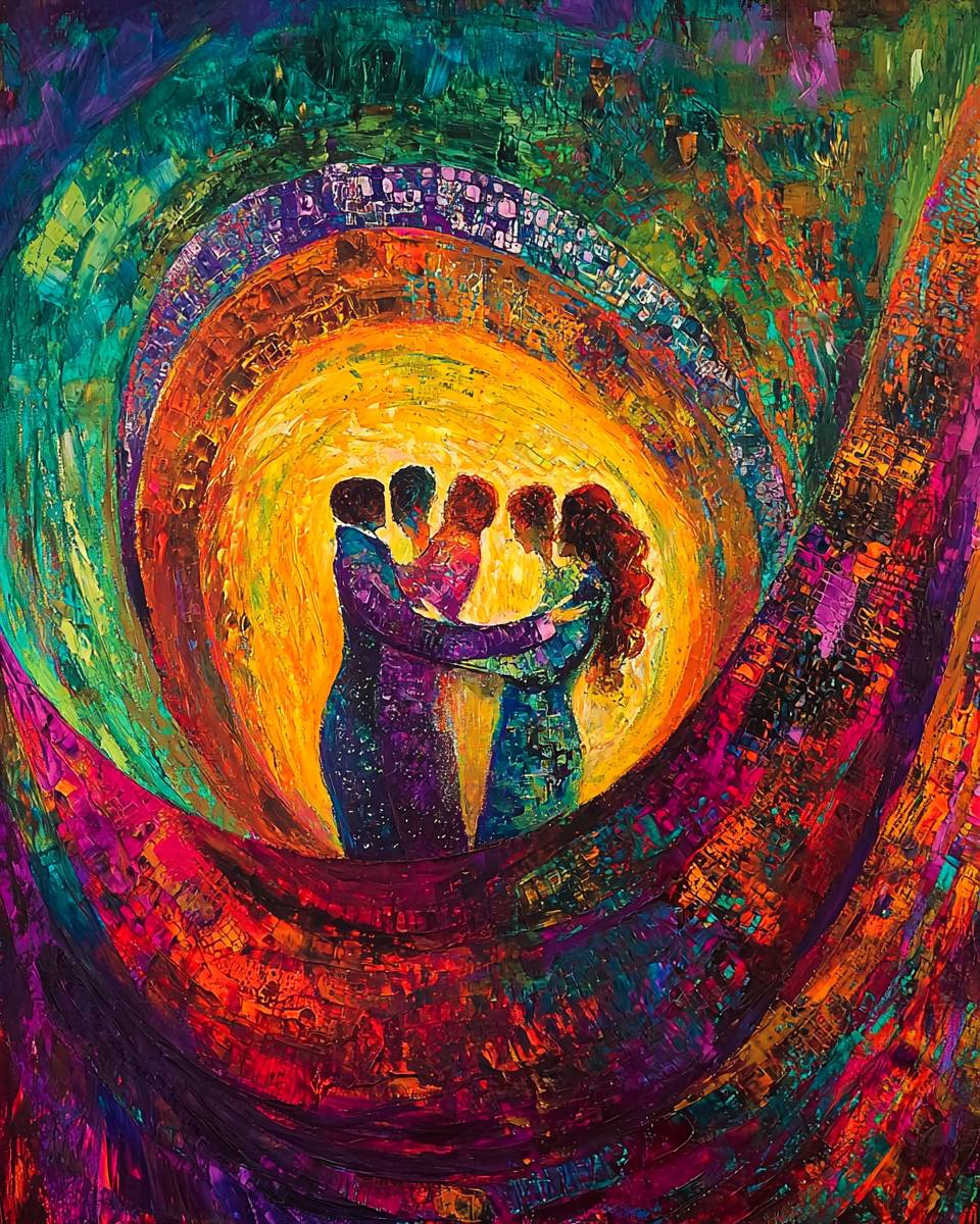 A vibrant, expressionistic scene inspired by Marc Chagall and Gustav Klimt, where figures are connected by beams of light, symbolizing the bonds of love. The image should use rich colors, swirling patterns, and a sense of movement to evoke the powerful, unseen connections between people. --v 6.1 --ar 4:5 --q 2 --style raw