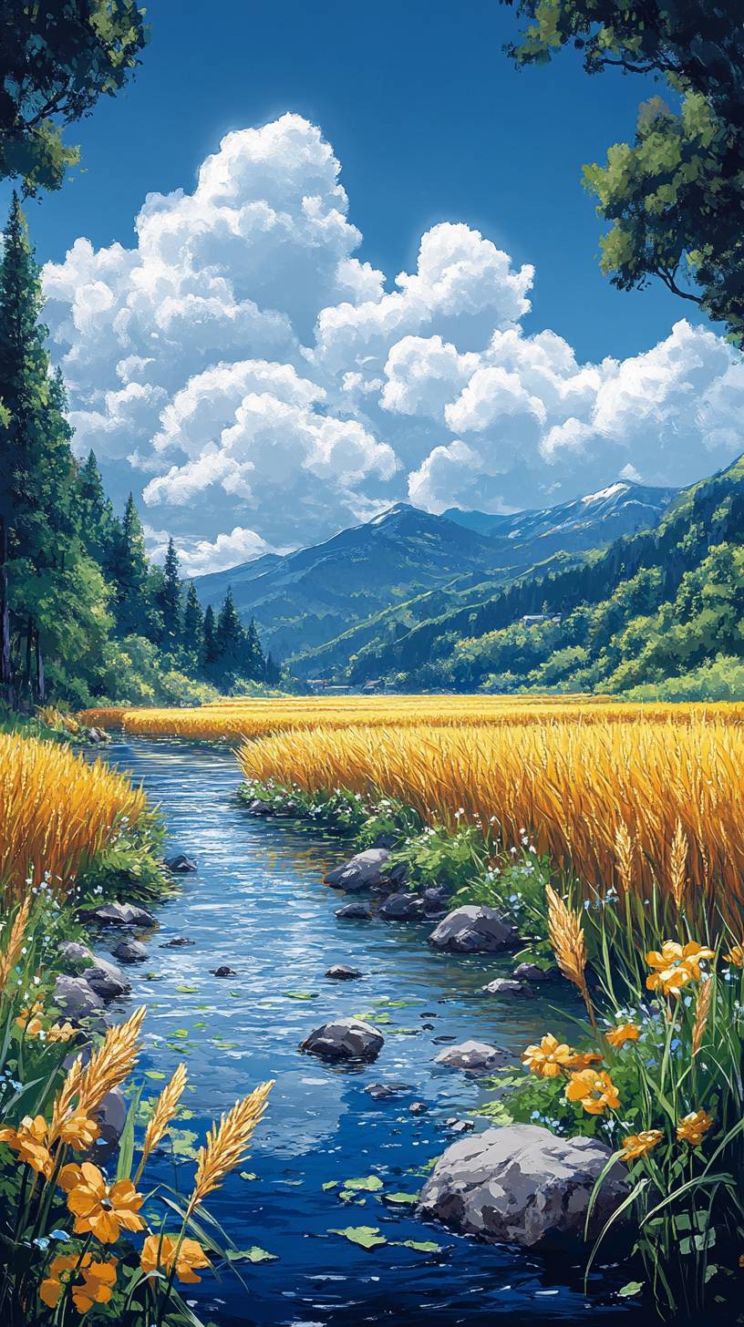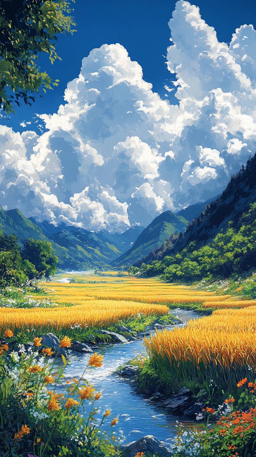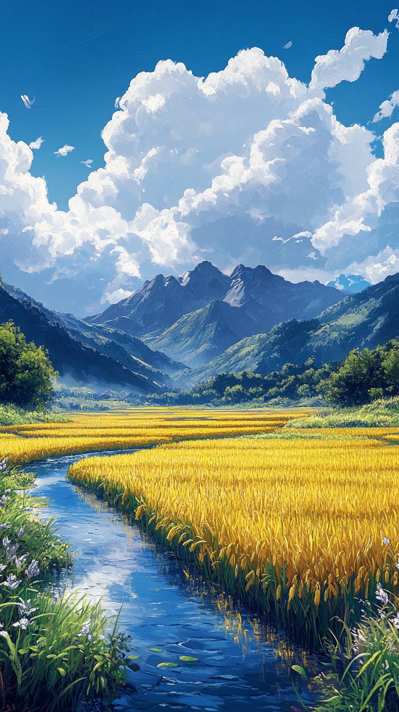 A poster with a large yellow rice field painting, a river bank, blue sky, white clouds, distant mountains, and rice ears. --ar 9:16 --stylize 550 --v 6.1