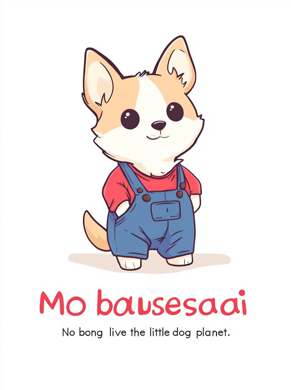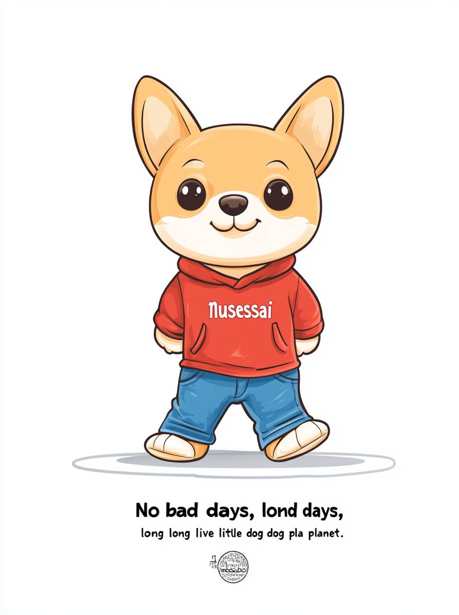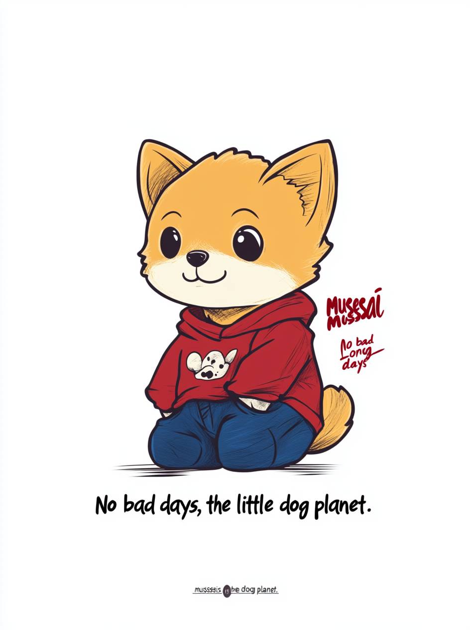 A minimalist logo for "musesai" featuring an adorable cartoon puppy in blue jeans and a red shirt, designed in the style of Jize Darko with bold text that reads "No bad days, long live the little dog planet." The logo has a white background and is cute, colorful, simple, and fun. --ar 95:128 --v 6.1