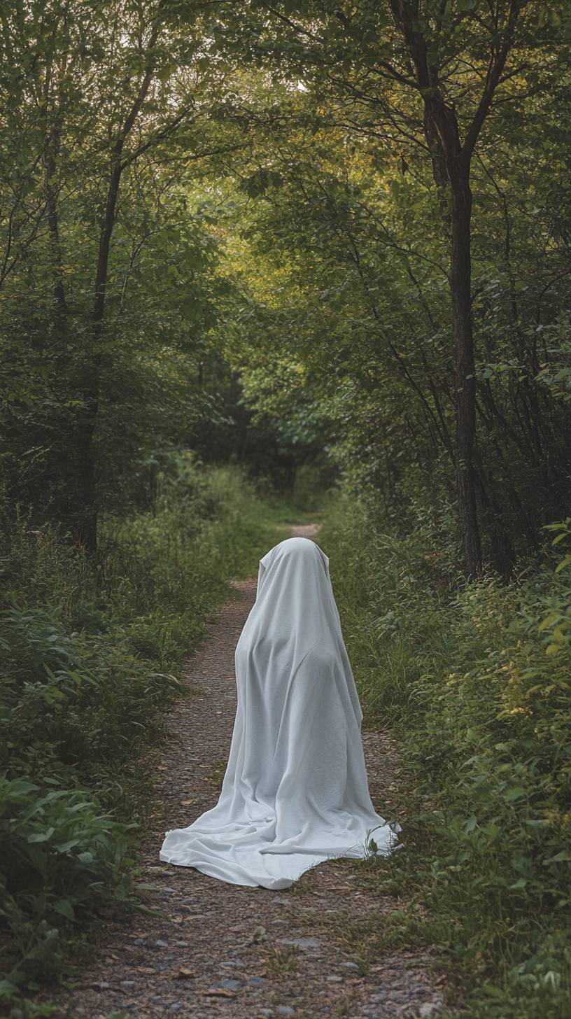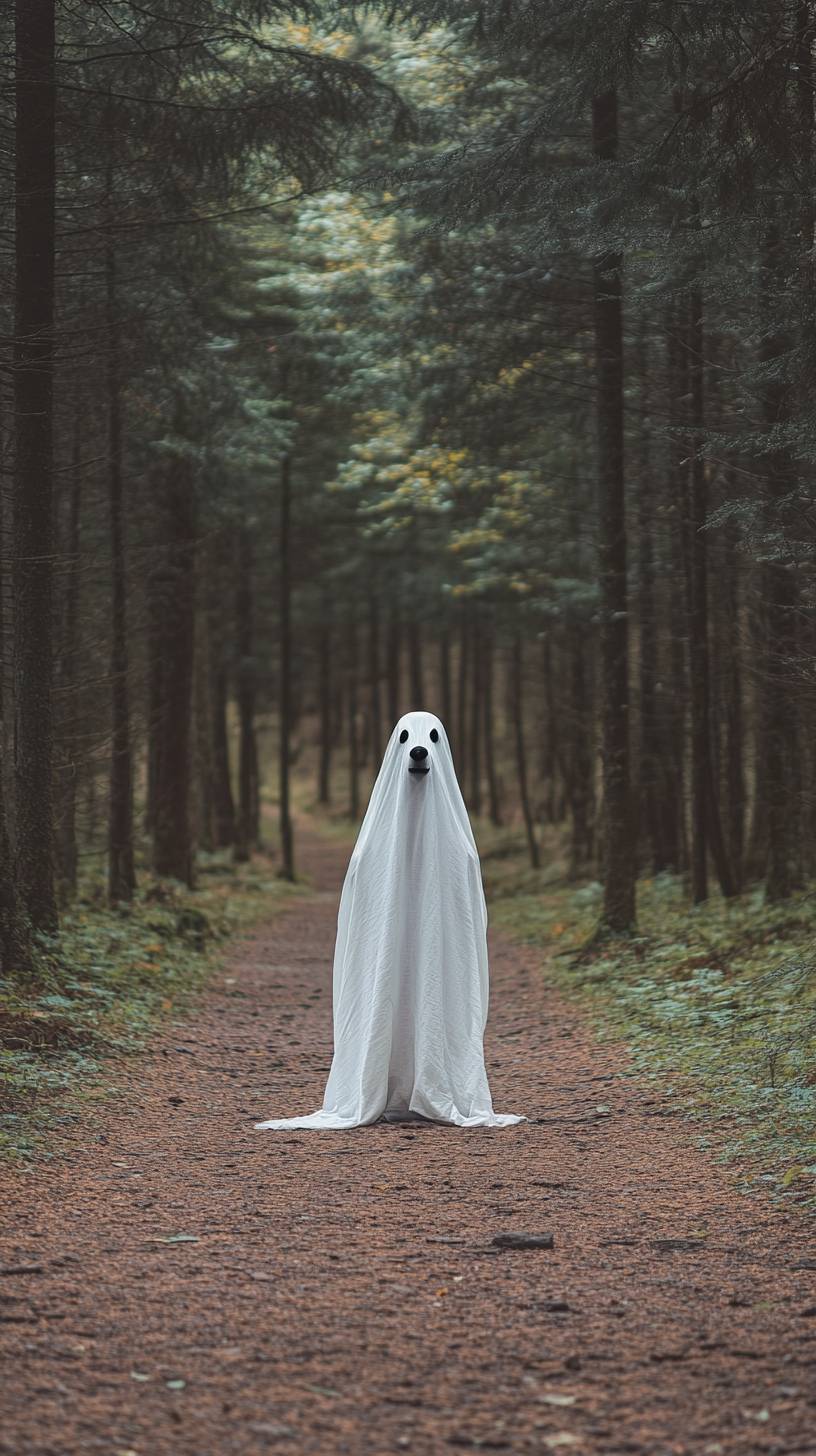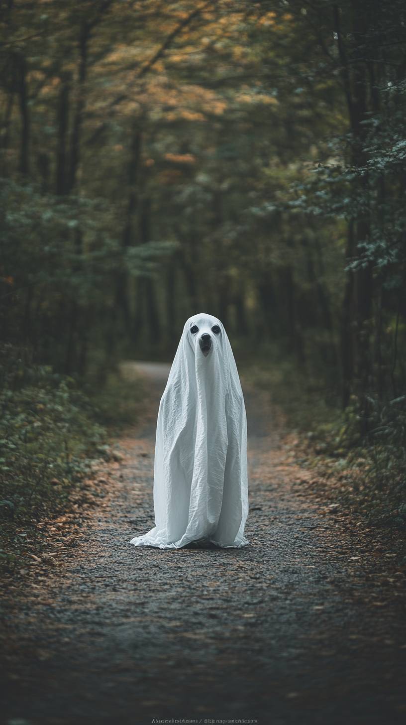 A photo of an anthropomorphic dog dressed as a ghost, wearing a white sheet in the middle of a forest path, with a simple and clean background, shot with a Sony A7c camera using a 2.8mm lens, resulting in a photorealistic image. --ar 9:16 --v 6.1