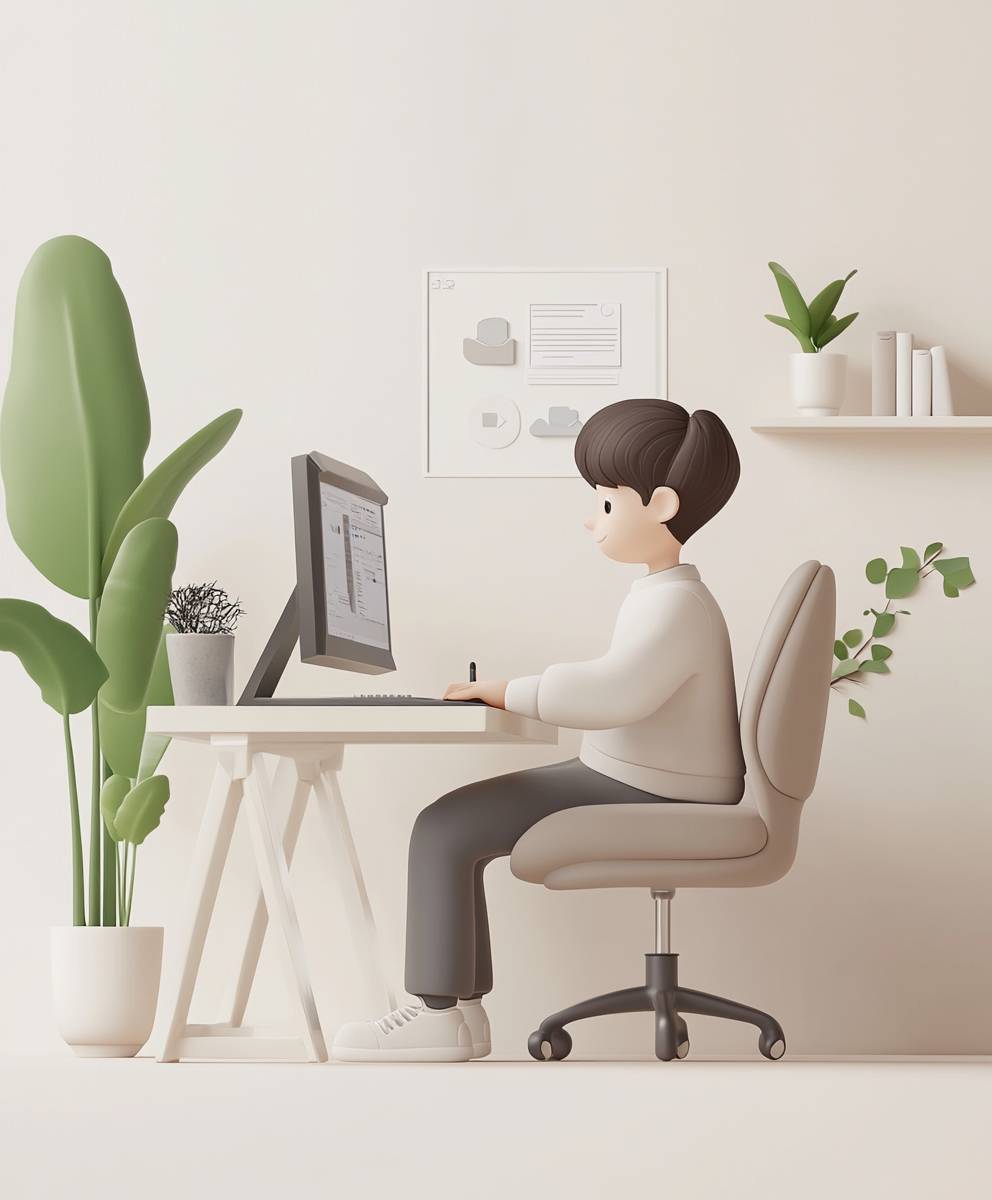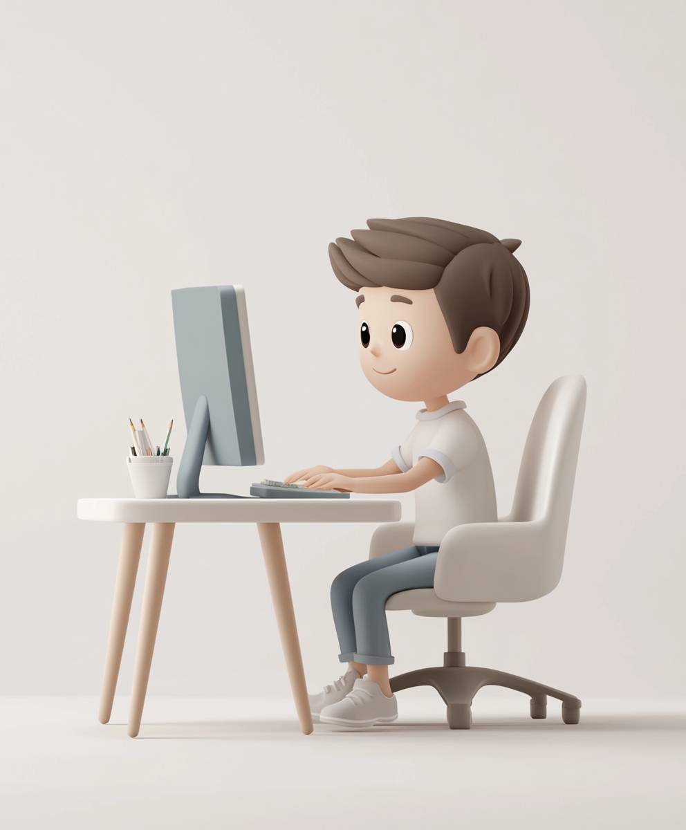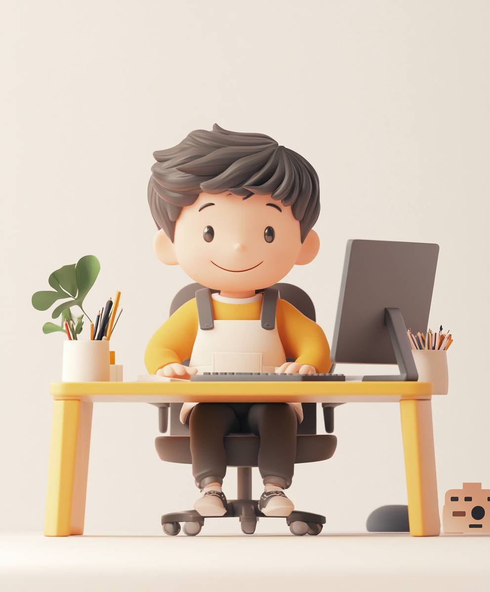 3D illustration, of a boy, working on his computer for his community manager job, minimalist 3D, neutral color palette, subtle shading, interactive elements, cartoon style, clean modern aesthetic, 3D web graphics.