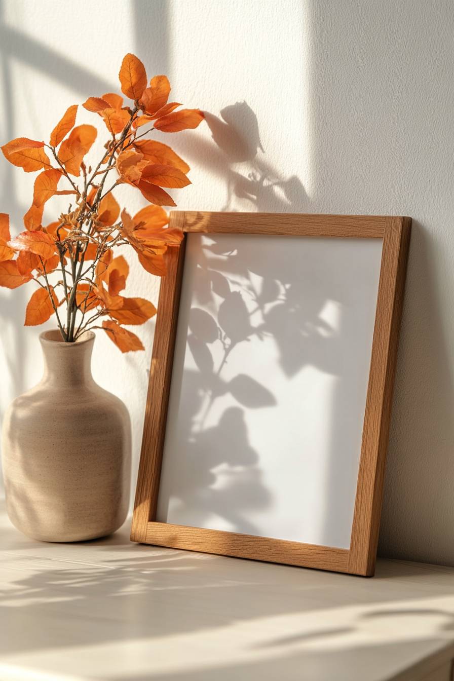 A 5x7 photo frame mockup on a table with a view of the beach, a vase and orange flowers next to it, sunset lighting, professional photography, high resolution, high detail, photorealistic, white background, wooden A4 picture frame, blank inside for text or design, in the style of professional photography. --ar 2:3 --style raw --v 6.1