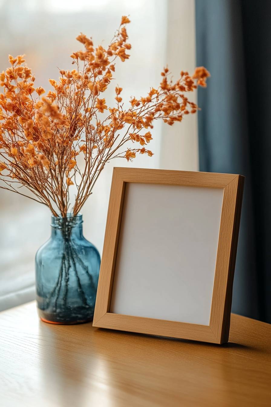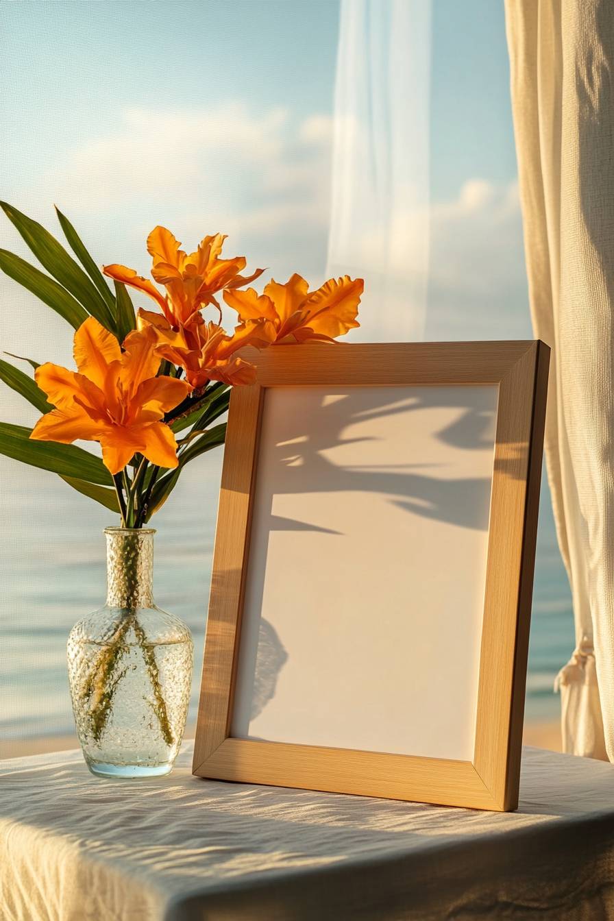 A 5x7 photo frame mockup on a table with a view of the beach, a vase and orange flowers next to it, sunset lighting, professional photography, high resolution, high detail, photorealistic, white background, wooden A4 picture frame, blank inside for text or design, in the style of professional photography.