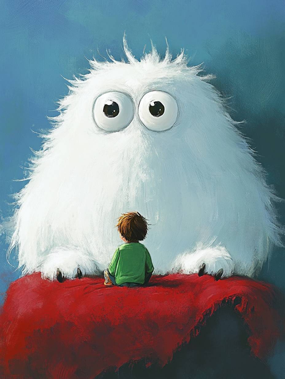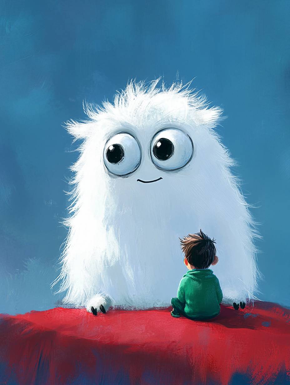 A cute, fluffy, and furry white monster with big eyes is sitting on a red blanket and watching a small boy in a green sweater, against a blue background, in the style of Tove Jansson and Goro Fujita.