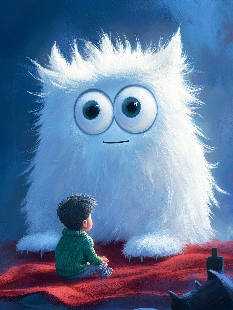 A cute, fluffy, and furry white monster with big eyes is sitting on a red blanket and watching a small boy in a green sweater, against a blue background, in the style of Tove Jansson and Goro Fujita. --ar 3:4 --v 6.1