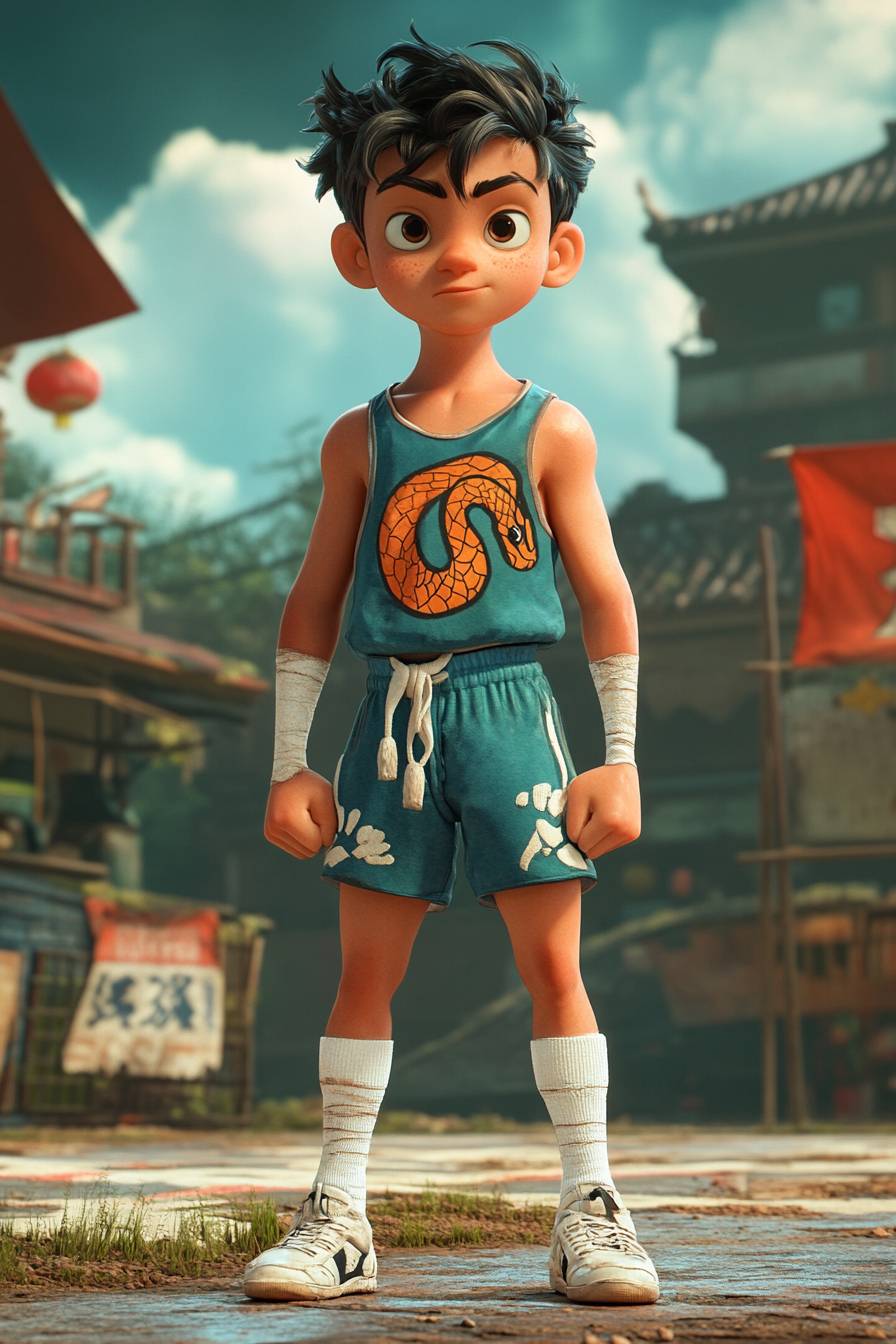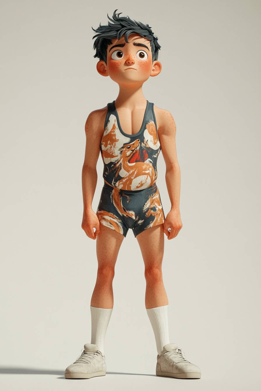 A 13-year-old Japan boy wears a singlet, a designed singlet with a snake totem. White socks, wrestler shoes. Stand on the field. The expression is confident and nervous, take a deep breath. Front. Pixar style. --ar 2:3 --stylize 250 --v 6.1