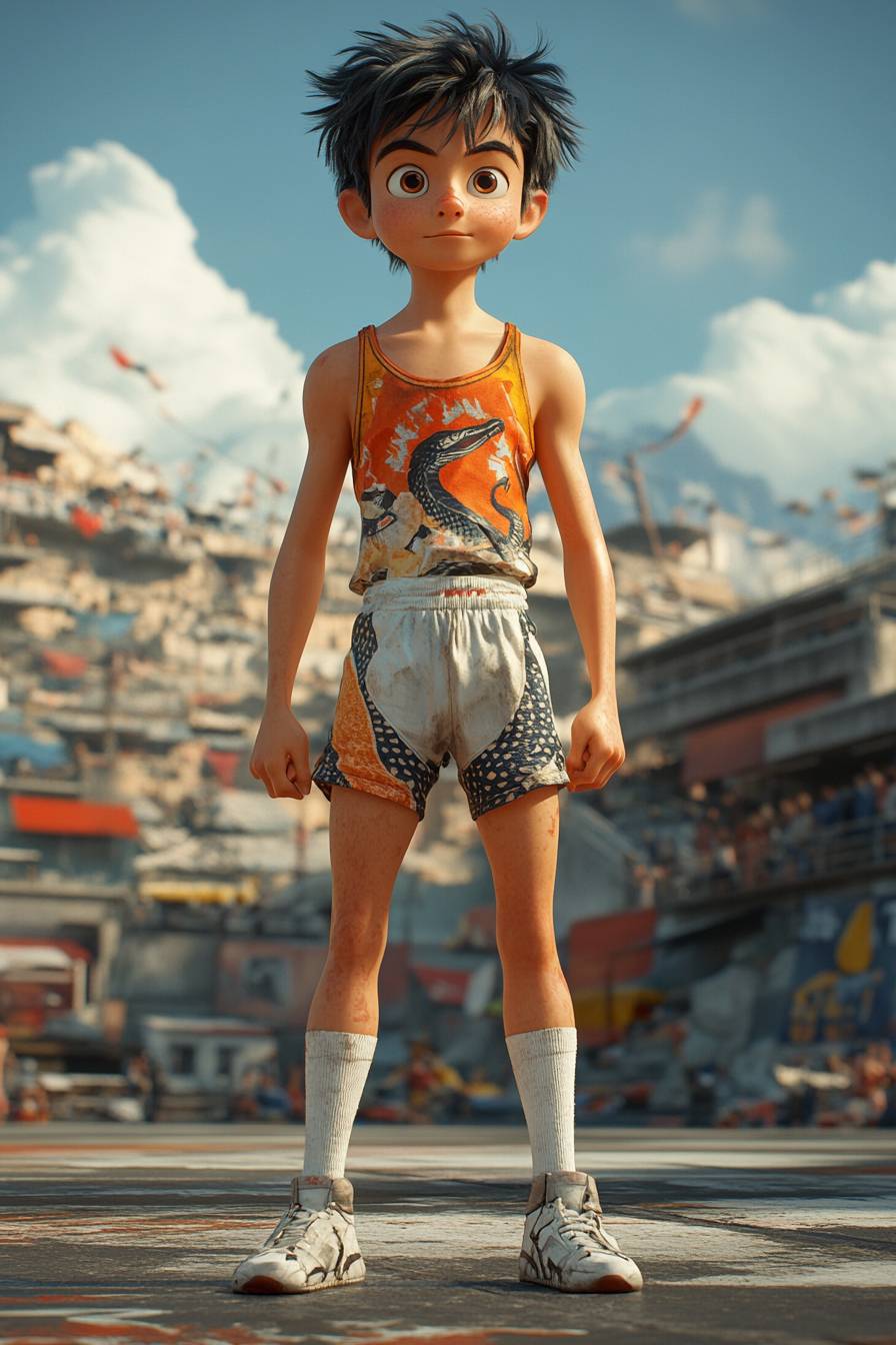 A 13-year-old Japanese boy wears a singlet with a snake totem design. White socks and wrestler shoes. He stands on the field, expressing confidence and nervousness, taking a deep breath. Facing forward. Pixar style.