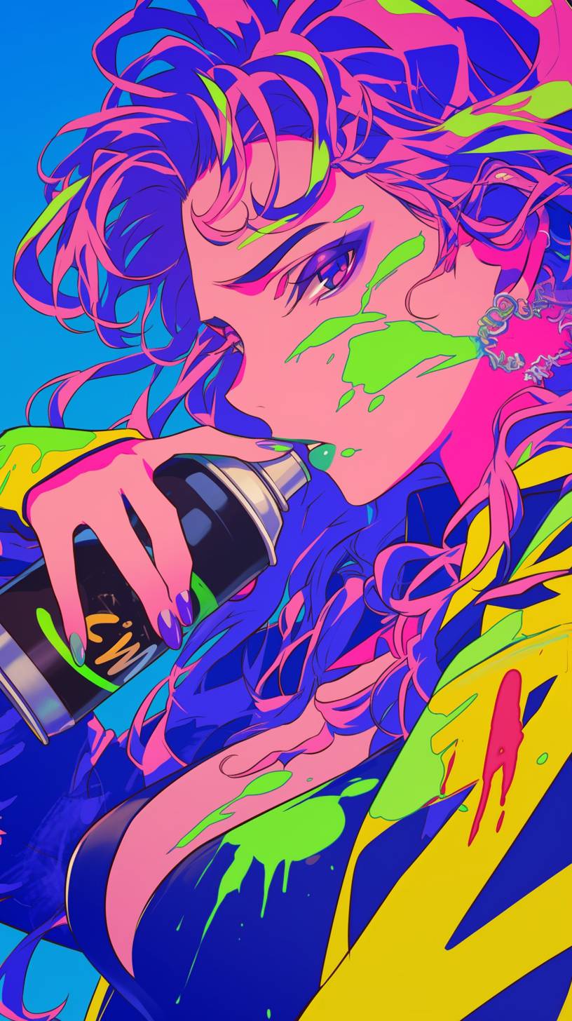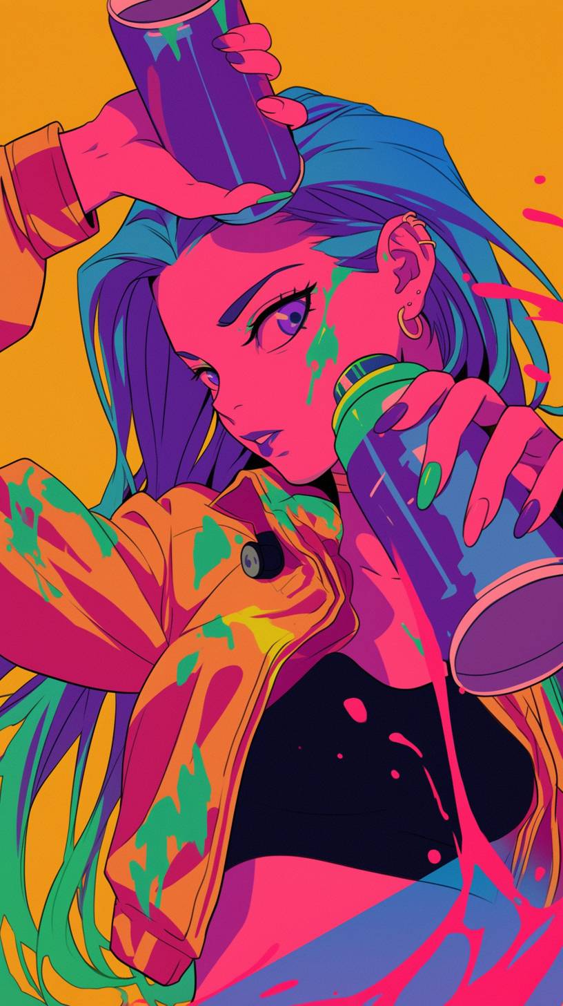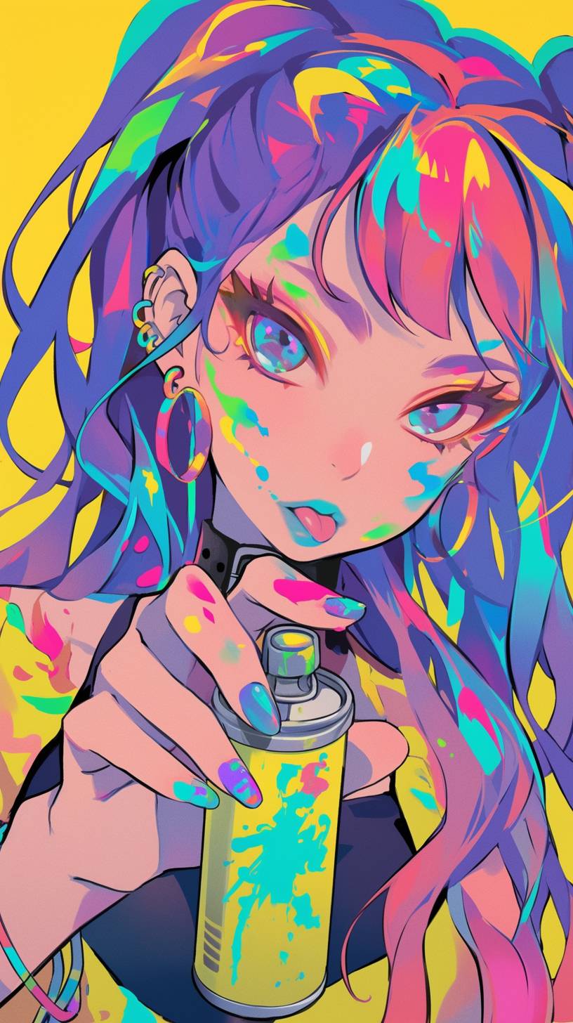 alternative young woman with colored hair, pressing down spray paint can, 80s funky clothes, bold outline, closeup shot, --ar 9:16 --niji 6