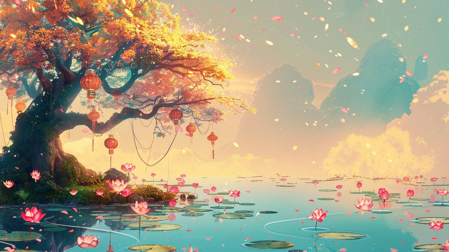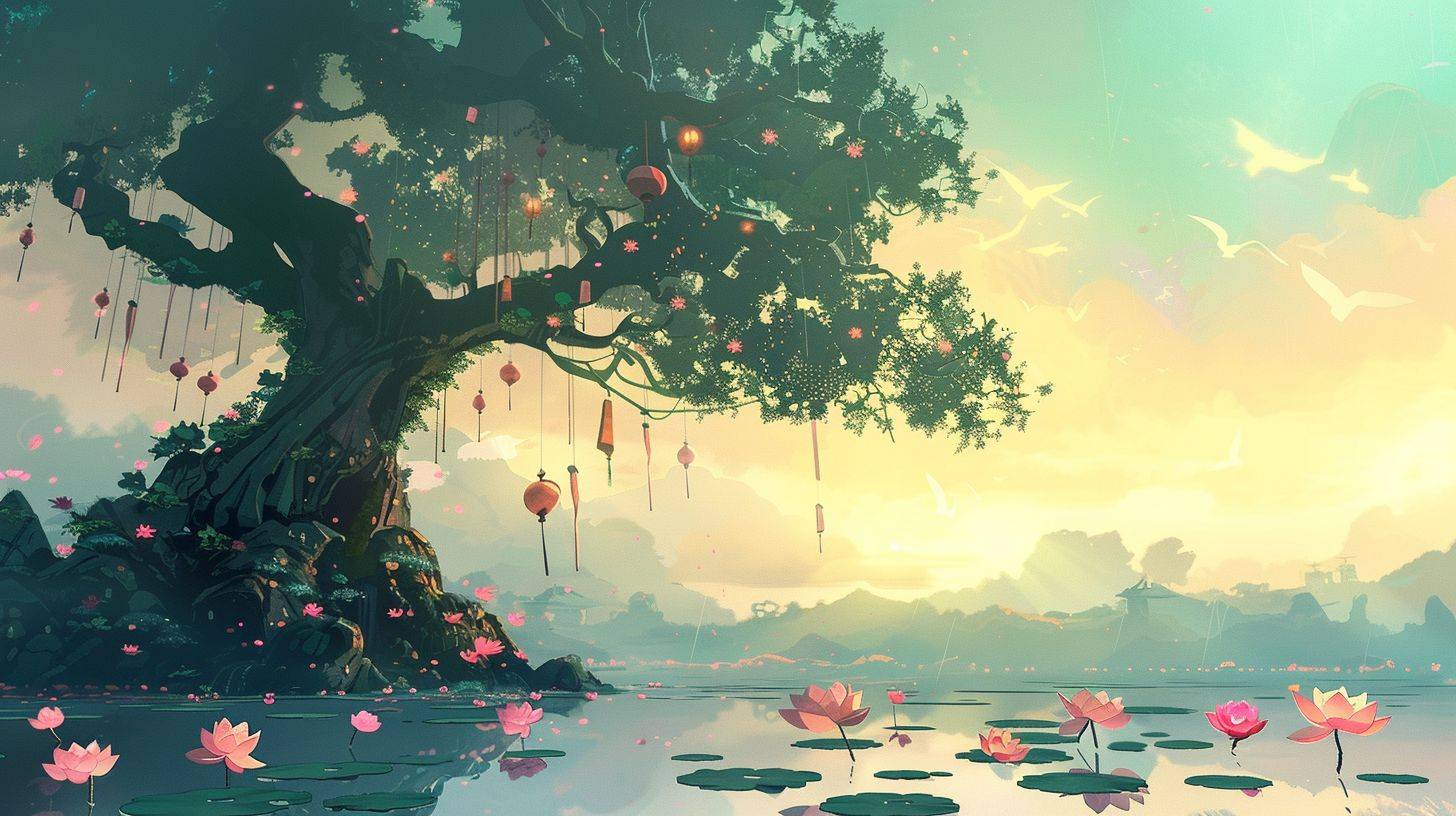 A Chinese style landscape painting depicting an ancient tree adorned with lotus flowers and lanterns, surrounded by water lilies in the pond, under a sky of light blue and yellow gradient with pink raindrops, creating a dreamy and ethereal atmosphere.