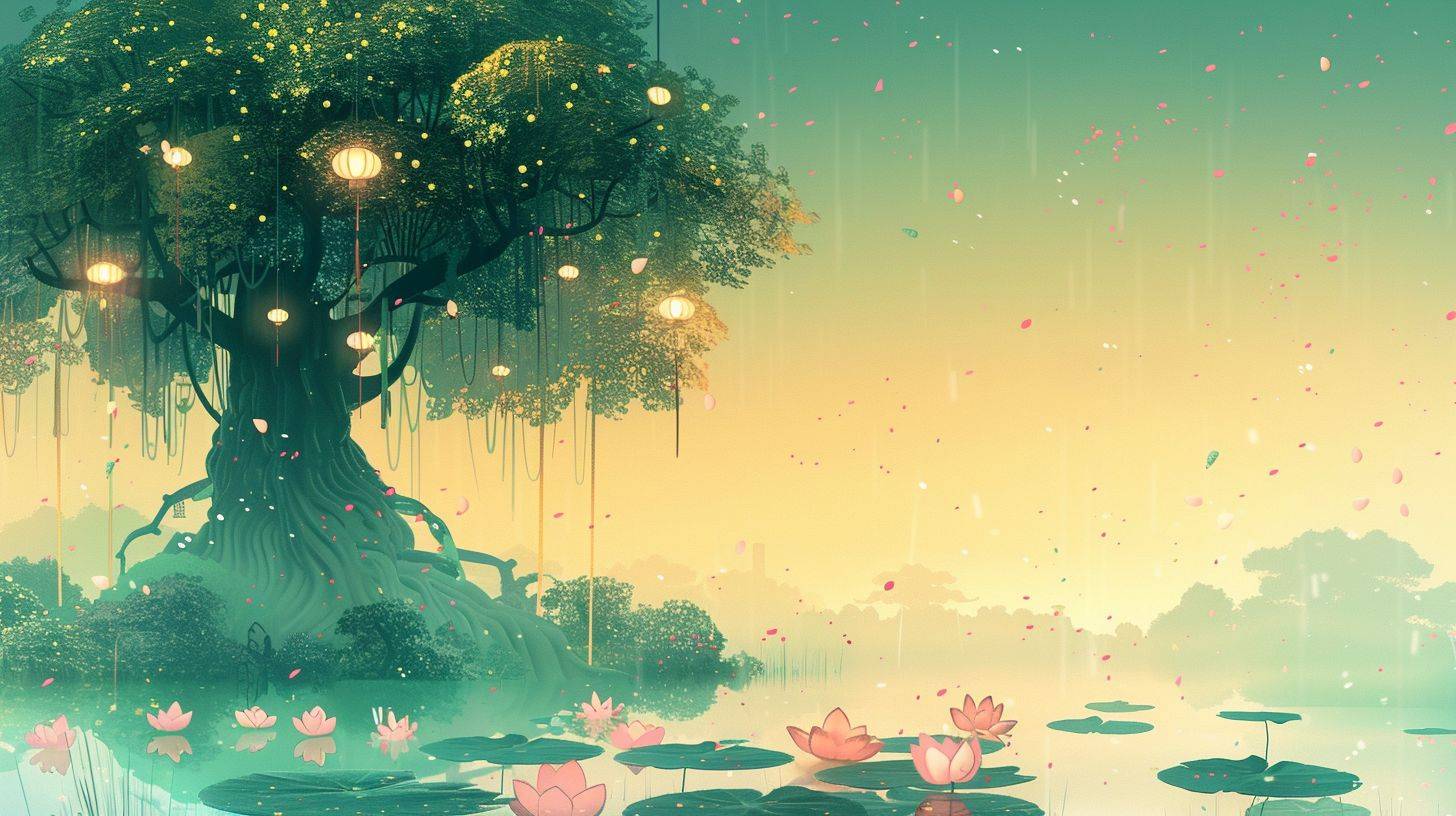 A Chinese style landscape painting of an ancient tree with lotus flowers and lanterns hanging on it, surrounded by water lilies in the pond below. The sky is a light blue and yellow gradient, with pink raindrops falling from above. It features soft colors, traditional animation techniques, flat illustrations, high definition, and a distant view. A fantasy scene with an ethereal and dreamy atmosphere. --ar 16:9