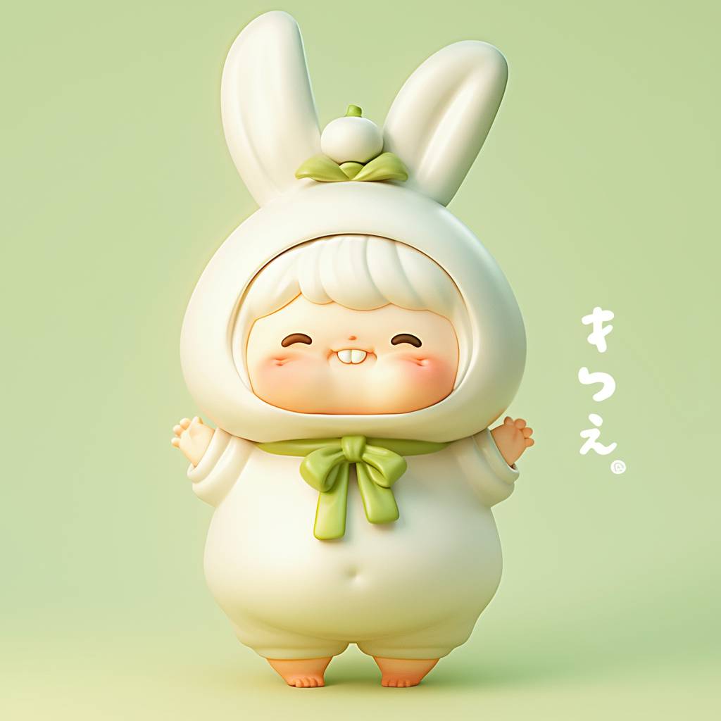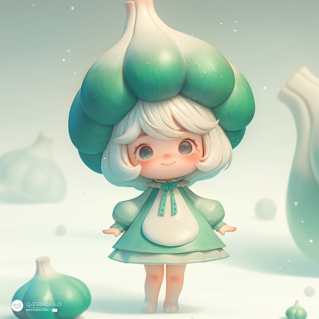Cute and chubby little girl vinyl toys, full body shot , barefoot,(The head is in the shape of a garlic,with a fresh a garlic shaped hat, Wearing a headgear shaped like a garlic),cute pose , The color contrast is bright,the figure is painted in white and green gradient,minimalism, white clean background, a cute Q version blind box style figure,with a detailed character design, delicate luster, Studio soft lighting, cute posture,white short hair ,chibi , kawaii , 3D rendering C4D, oc render, 8K HD, best quality ,UHD --ar 1:1 --niji 6
