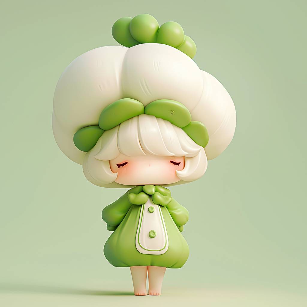 Cute and chubby little girl vinyl toys, full body shot, barefoot, (The head is in the shape of garlic, wearing a fresh garlic-shaped hat and headgear), cute pose, the color contrast is bright, the figure is painted in white and green gradient, minimalism, white clean background, a cute Q version blind box style figure, with a detailed character design, delicate luster, studio soft lighting, cute posture, white short hair, chibi, kawaii, 3D rendering C4D, OC render, 8K HD, best quality, UHD