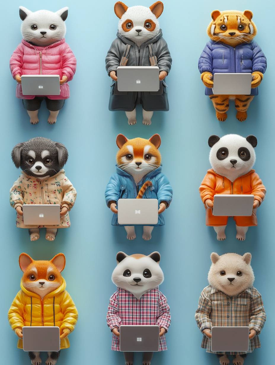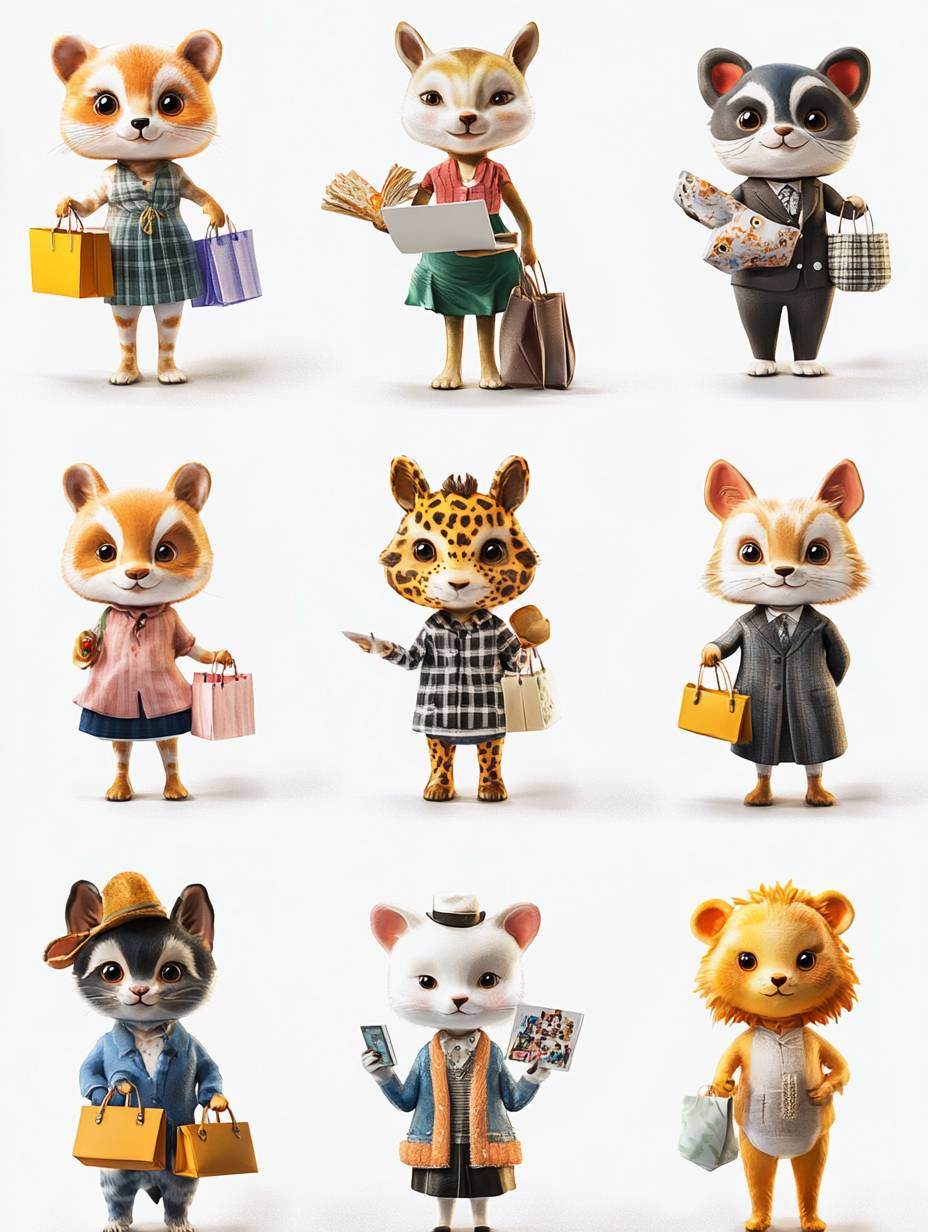 Cute anthropomorphic animal style, these different animals run on the white keyboard, there are dogs, cats, pandas, tigers, lions, giraffes, and more. They wear different human professional clothing, such as: skirts, suits, shirts, hoodies, plaid shirts, evening gowns, shorts, baseball caps. These animals are respectively holding shopping bags, laptops, suitcases, carts, backpacks, simple and clean background, miniaturized world style, creative advertising poster design, top-down Angle, high-definition photography, high resolution, character details, perfect light and shadow processing, 3D rendering, super realistic, colorful, happy atmosphere. --ar 3:4 --iw 1.49 --v 6.1