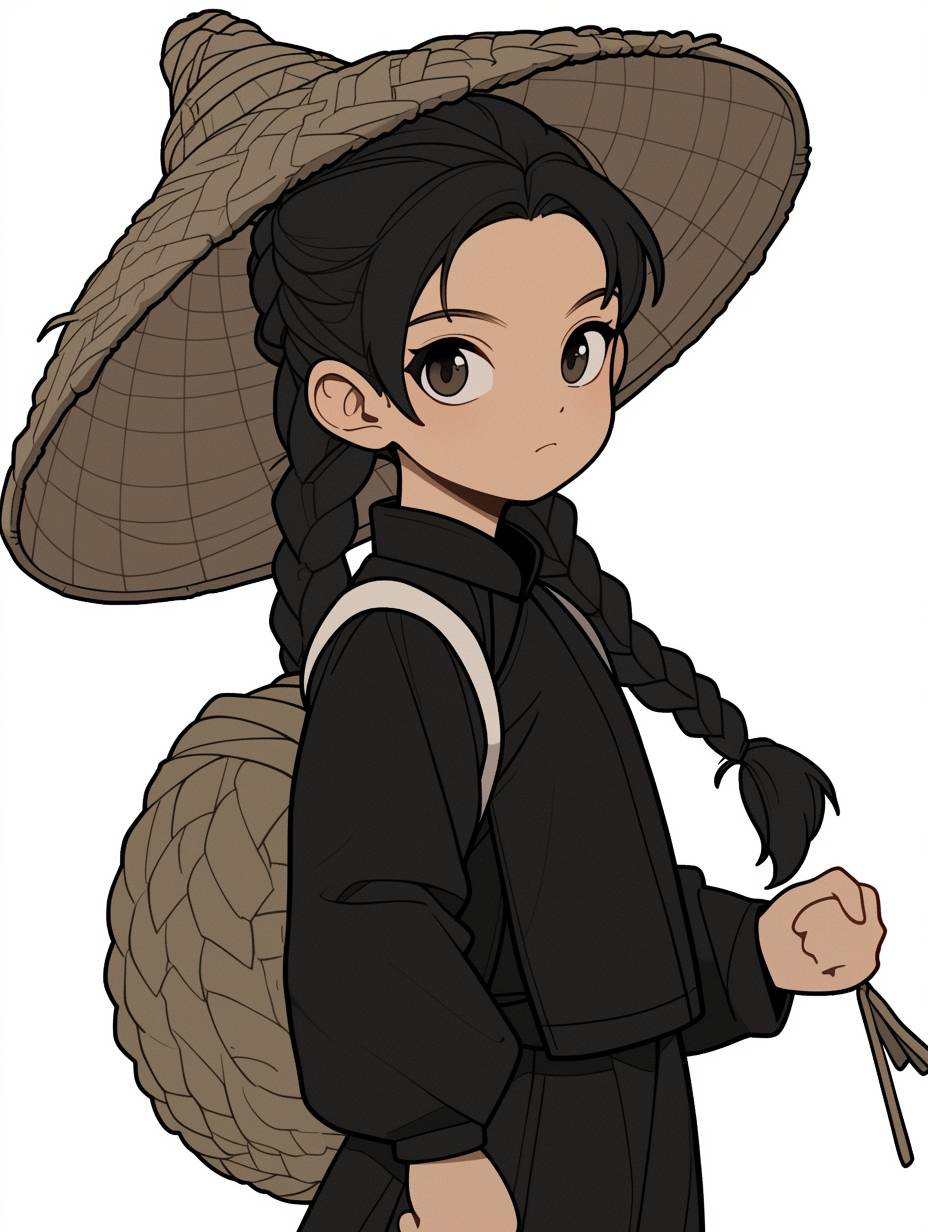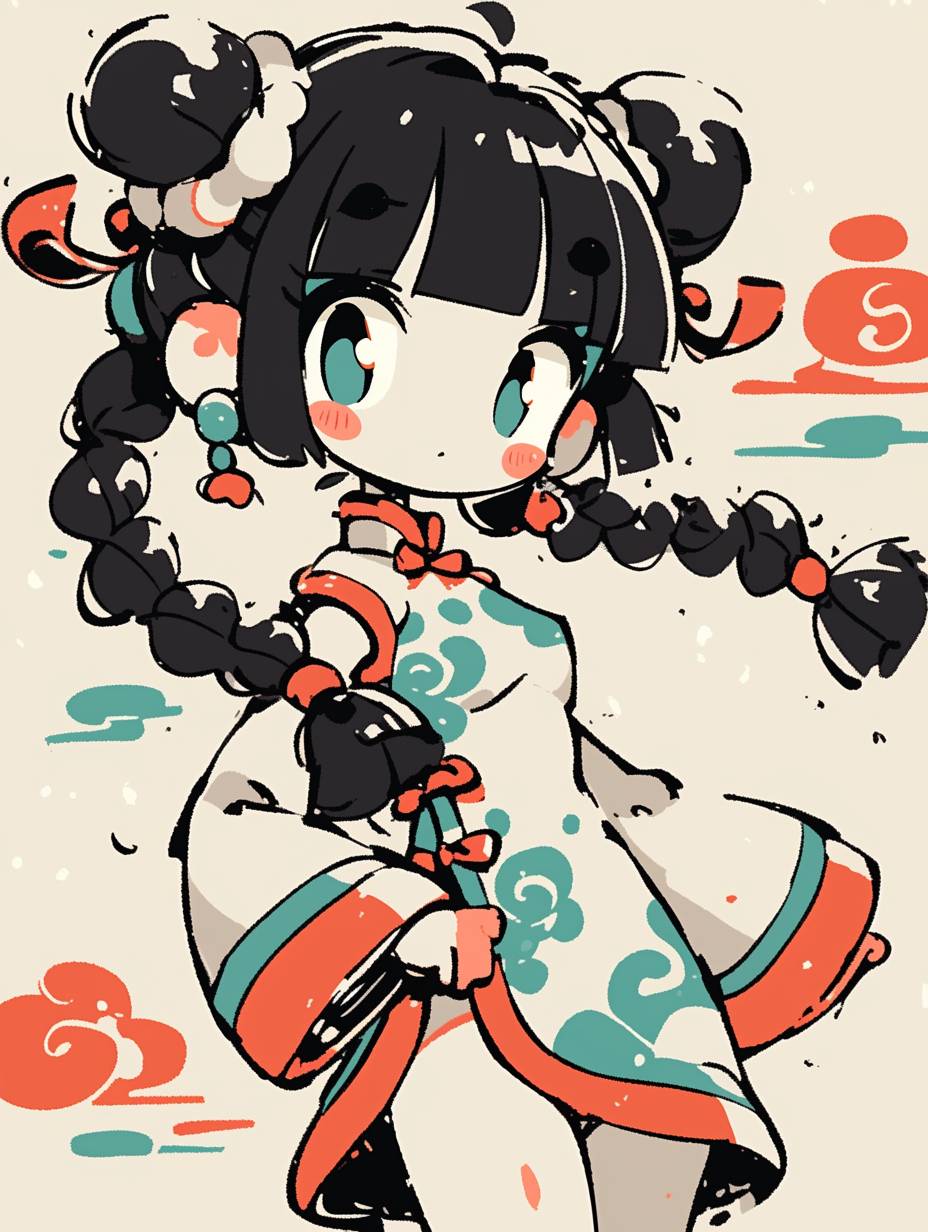 A lovely Chinese girl cartoon, Fried Dough Twists braid, wayward, walking, Kunting black style, whimsical cartoon style, full of fantasy and imagination, vector, comic art, sophistic pictures, white background, clear illustrations, simple details, minimalism --ar 3:4 --style raw --stylize 1000 --niji 6