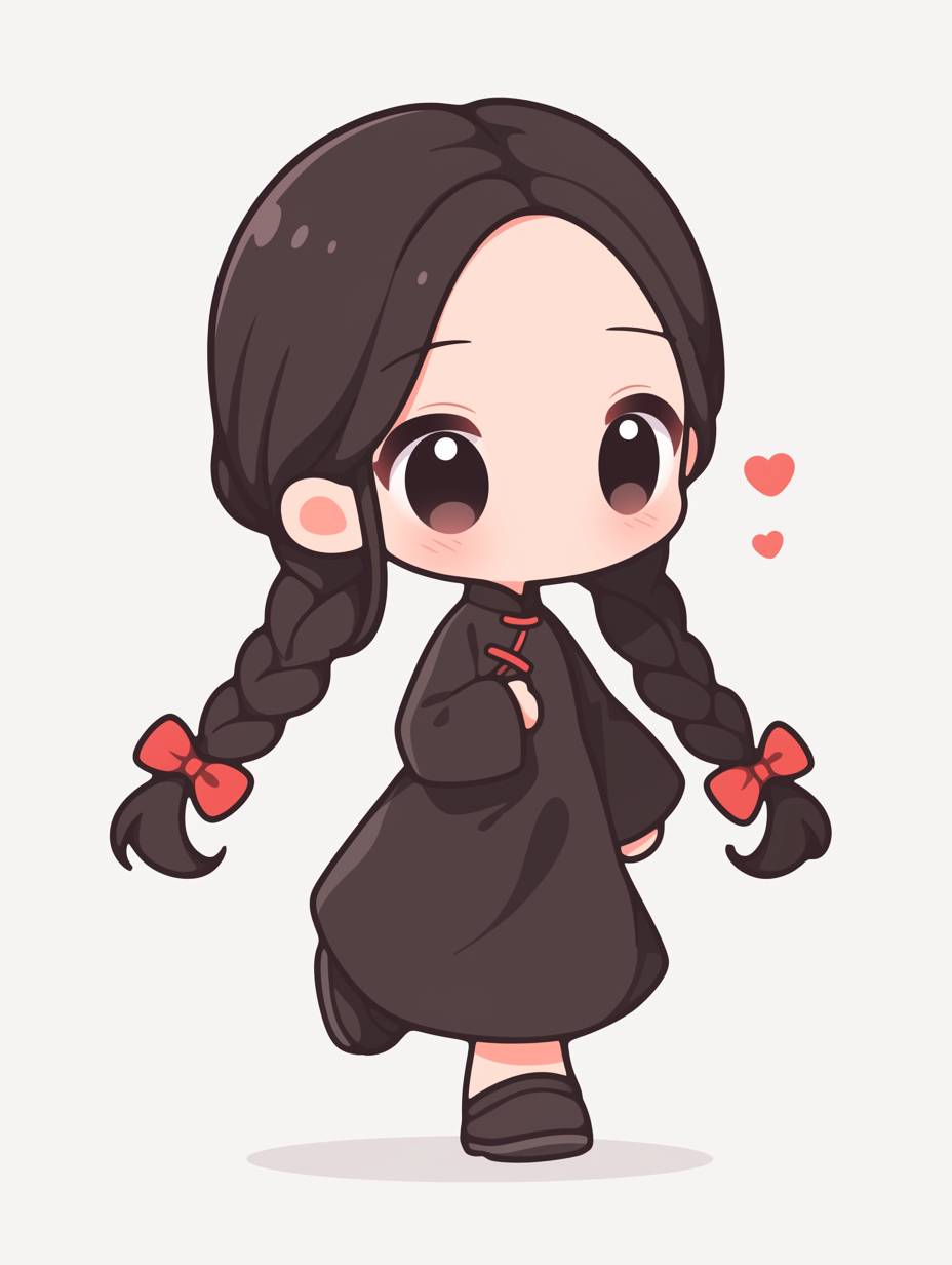 A lovely Chinese girl cartoon, Fried Dough Twists braid, wayward, walking, Kunting black style, whimsical cartoon style, full of fantasy and imagination, vector, comic art, sophisticated pictures, white background, clear illustrations, simple details, minimalism.