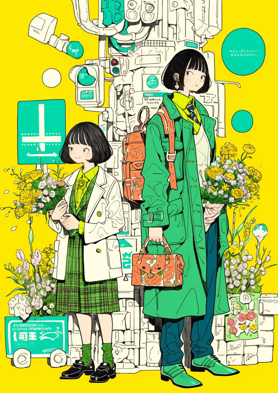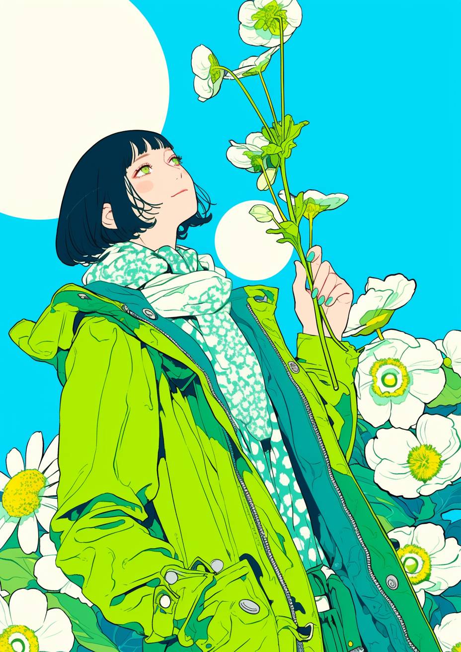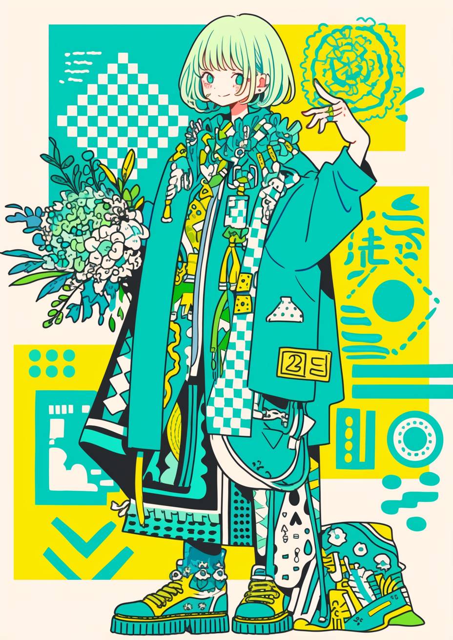 pop cute poster art, simple flat deformation, trading card design, girl in a stylish green set-up suit with a sharp bob haircut, smiling softly while holding a bouquet of mint green flowers, her outfit sleek and tailored, giving off a chic and modern vibe, strike her pose, simple geometric pattern background, contrapposto, painting by taro tanaka, mint green, soft beige, emerald green, masterpiece, epic, insanely detailed,slamdunk --chaos 1 --ar 5:7 --style raw --personalize 297cy4z --stylize 1000 --niji 6
