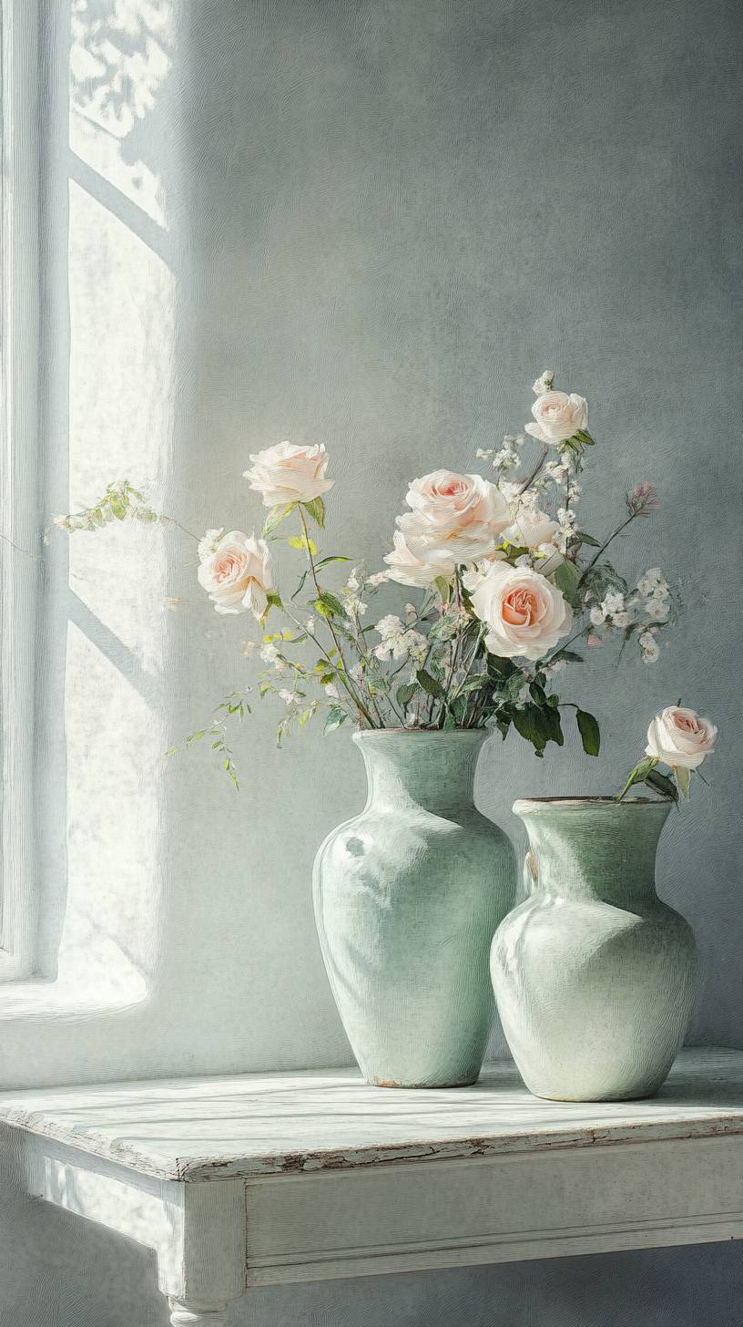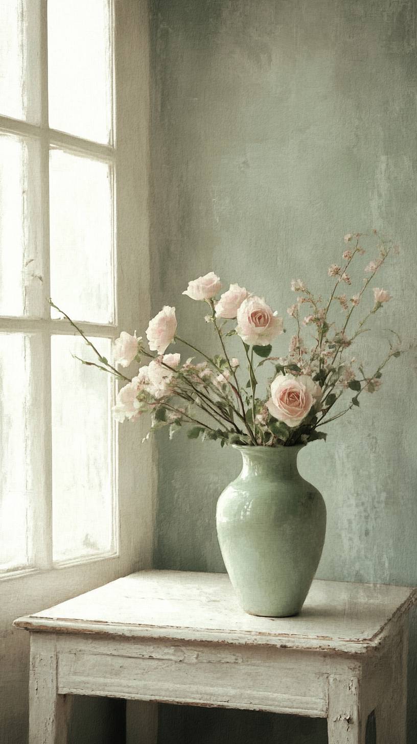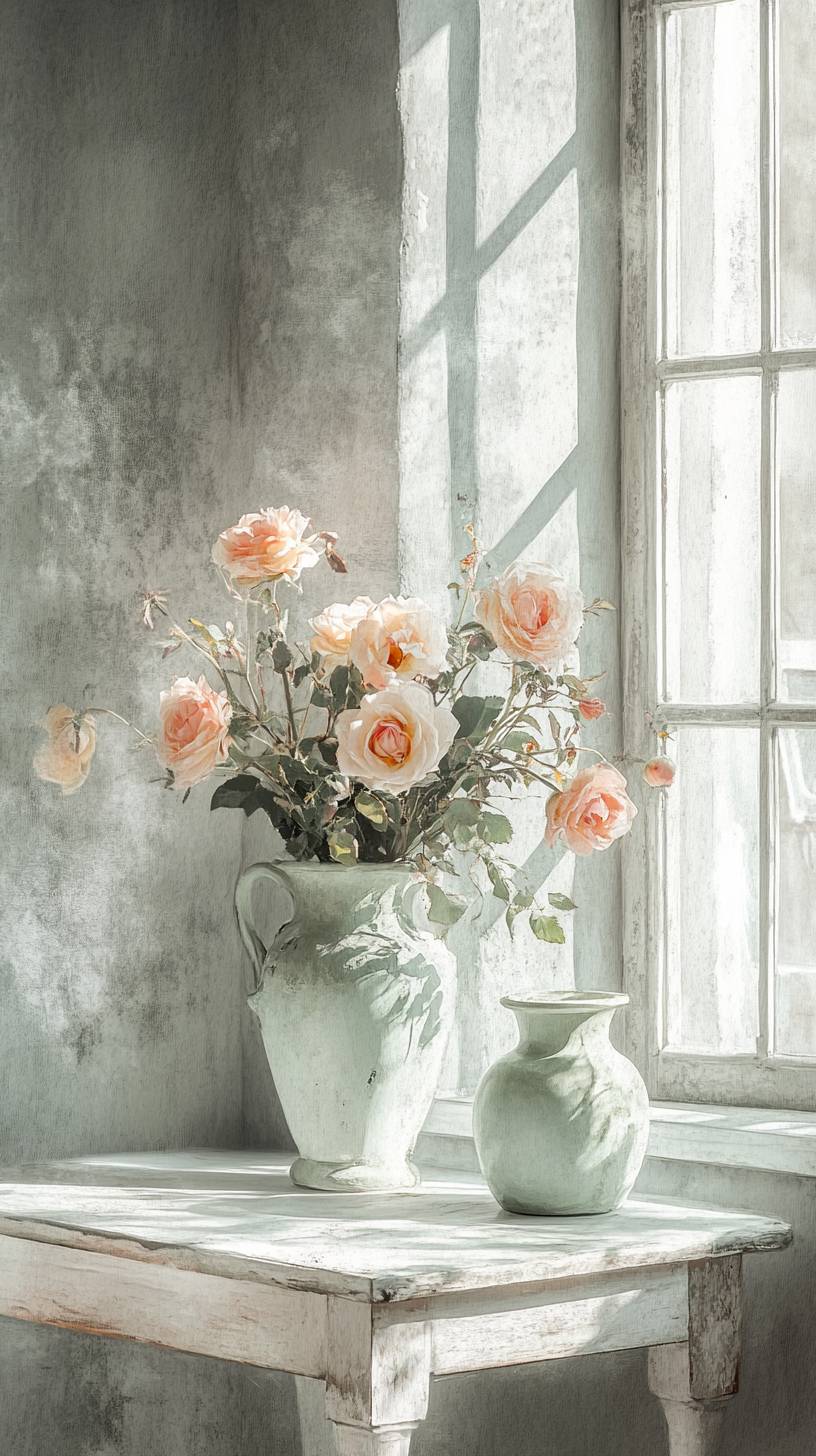 A vase with flowers on top of an old white table, a vase and flower arrangement on the right side, pale green vases with roses in front of a window, in the style of a soft watercolor painting style, gray wall background, a minimalistic floral still life, digital art, a flat perspective, muted pastel colors, a soft shadow effect, a vintage aesthetic, and a serene mood. --ar 9:16 --v 6.1