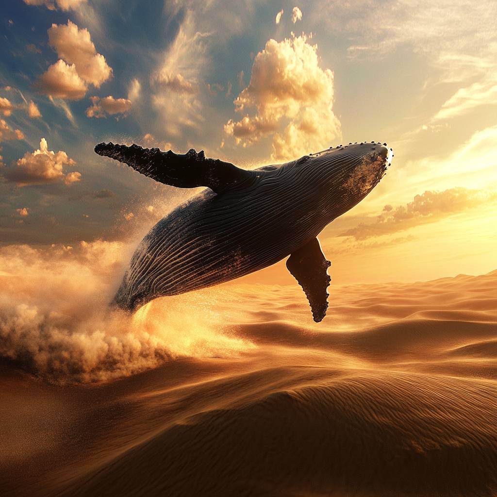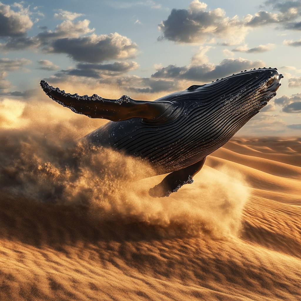 A humpback whale breaching in desert dunes, ultra-realistic photography style.