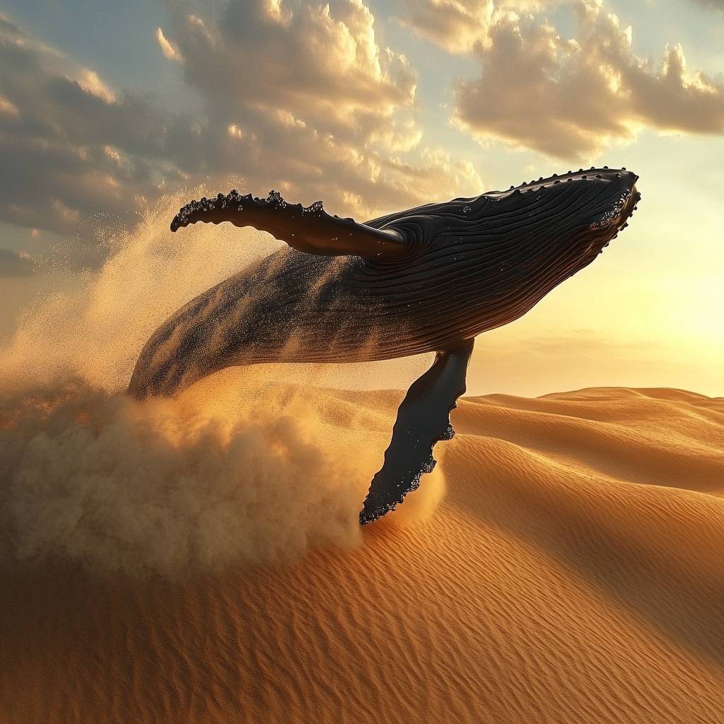 Prompt:A black humpback whale breaching in the desert dunes, golden hour lighting, dust clouds, in the style of ultra realistic photography. shot with a Canon DSLR camera, photorealistic,hyper-realistic 3D rendering