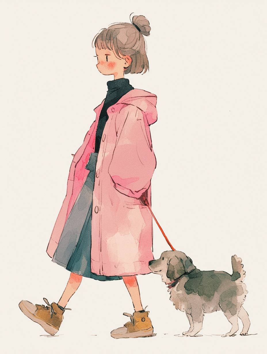 A cute girl in a pink coat walking her dog, simple lines, simple colors, white background, kawaii style, cute illustration for a children's book, simple doodle art, watercolor on paper, simple line drawings, clean and sharp focus, high resolution.