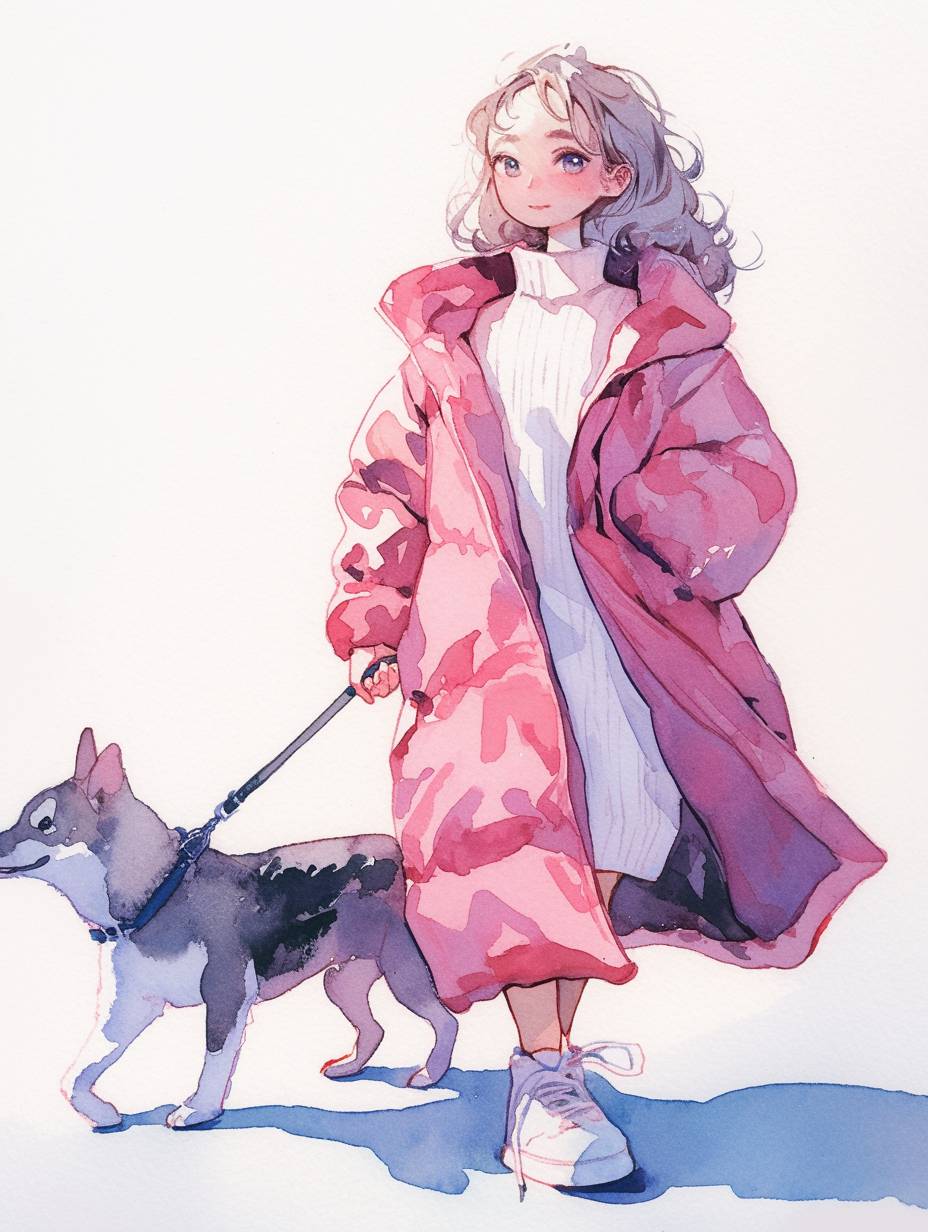 simple drawing of cute girl in pink coat walking her dog, simple lines, simple colors, white background, kawaii style, cute illustration for children's book, simple doodle art, watercolor on paper, simple line drawings, clean and sharp focus, high resolution, --ar 3:4 --stylize 150 --niji 6