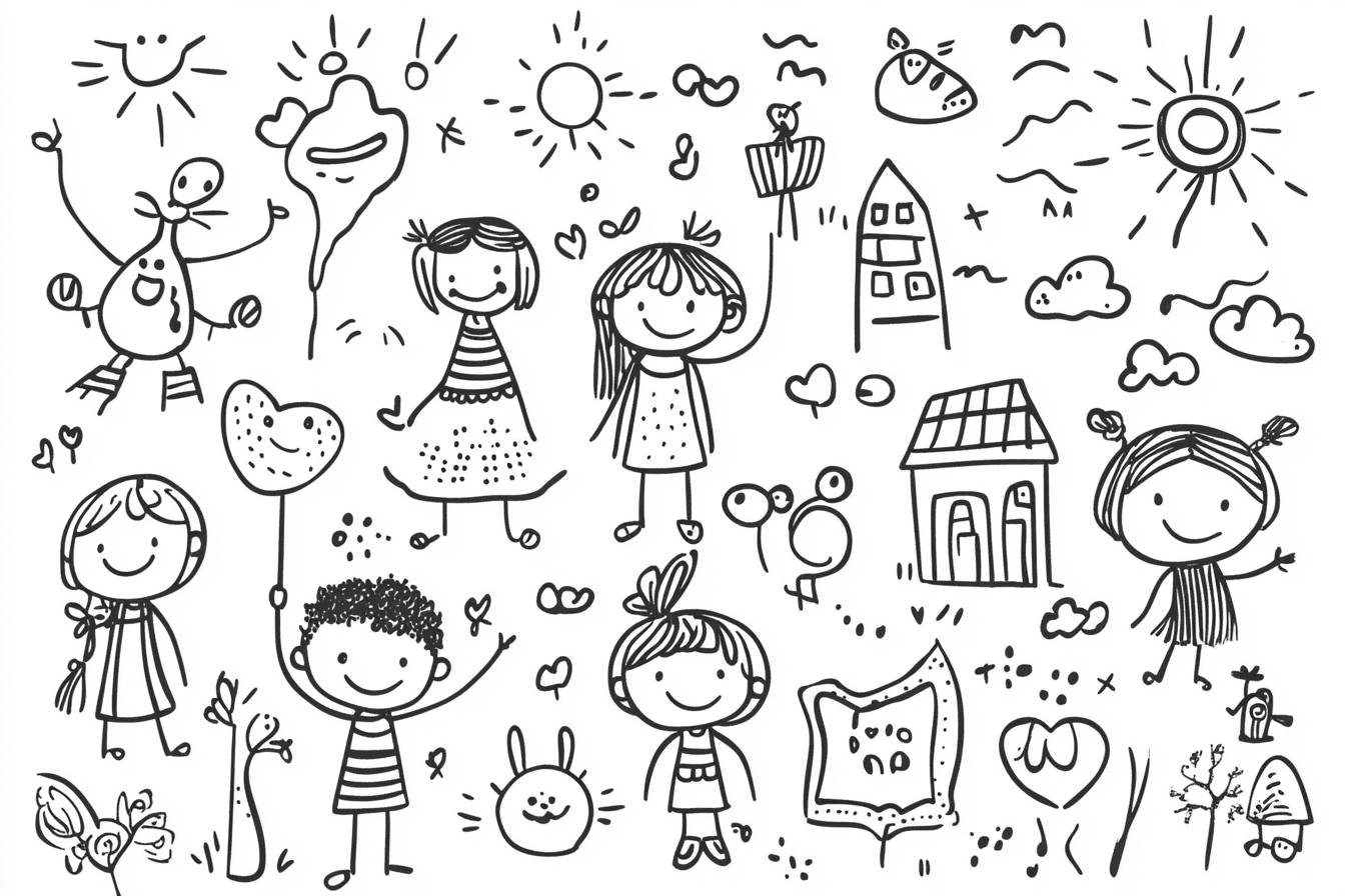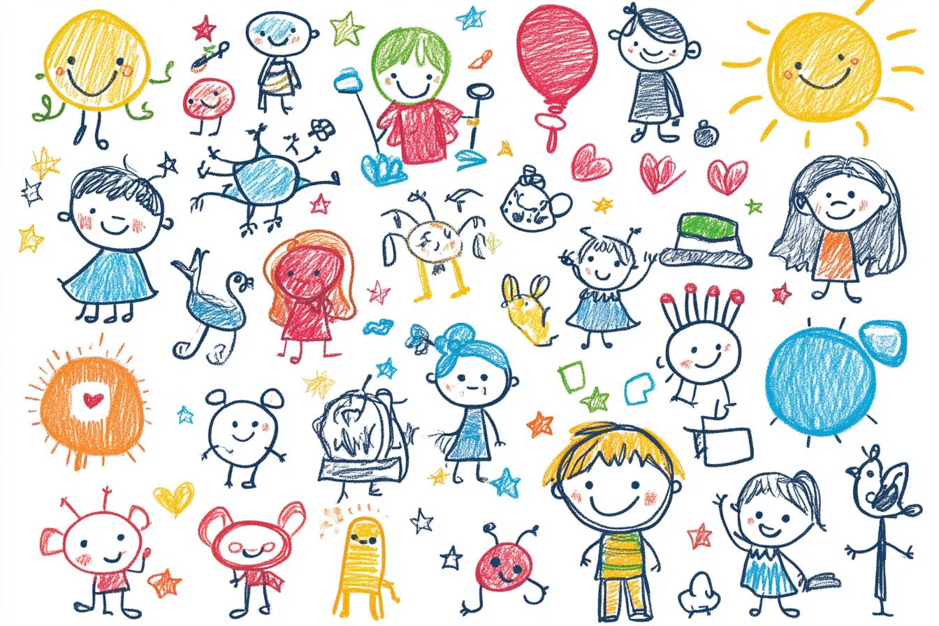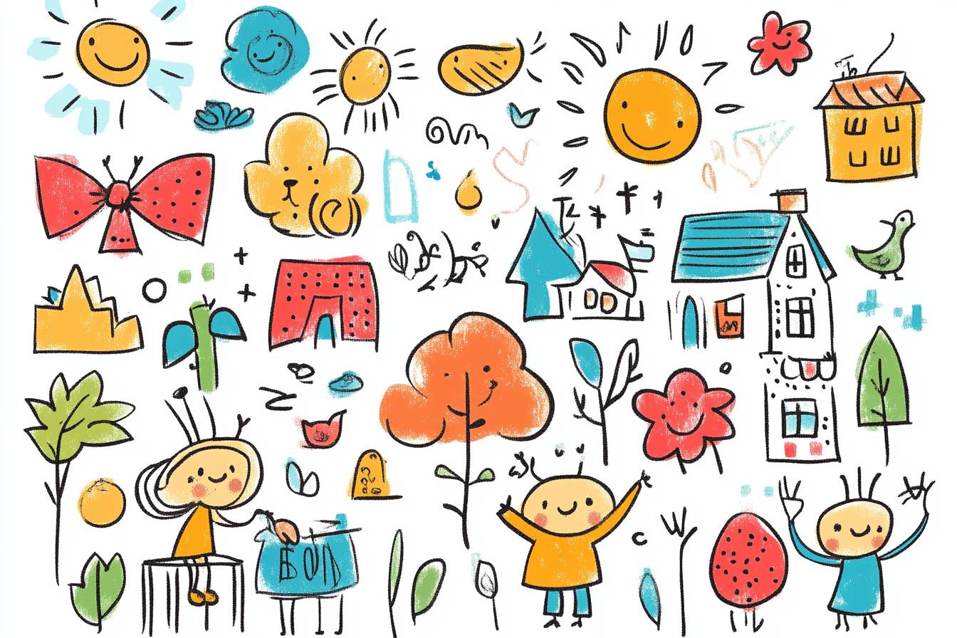 Funny children drawing vector doodle set