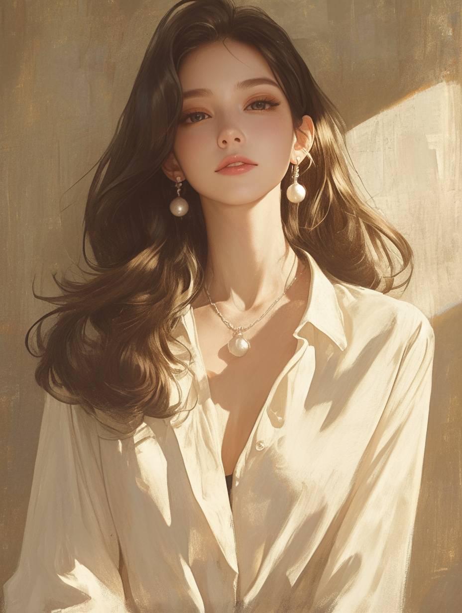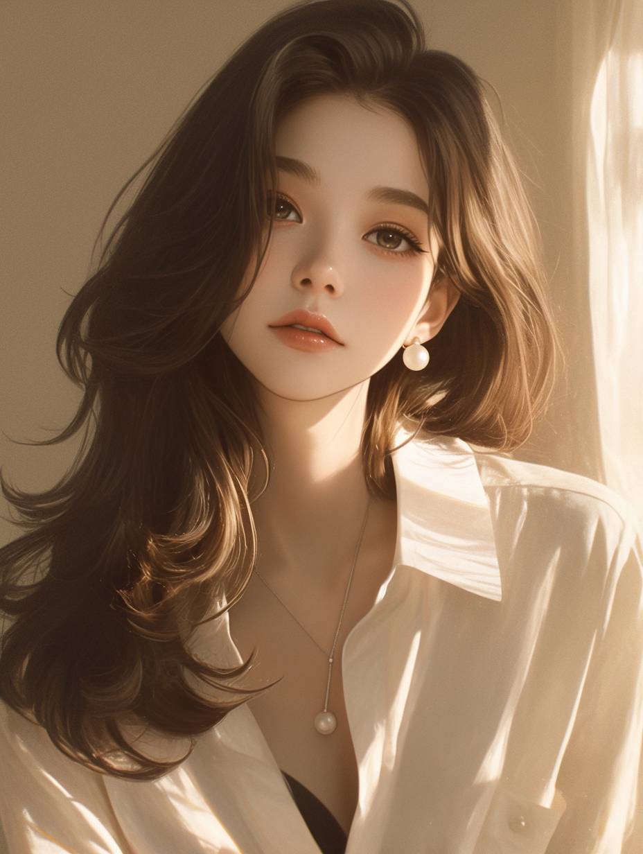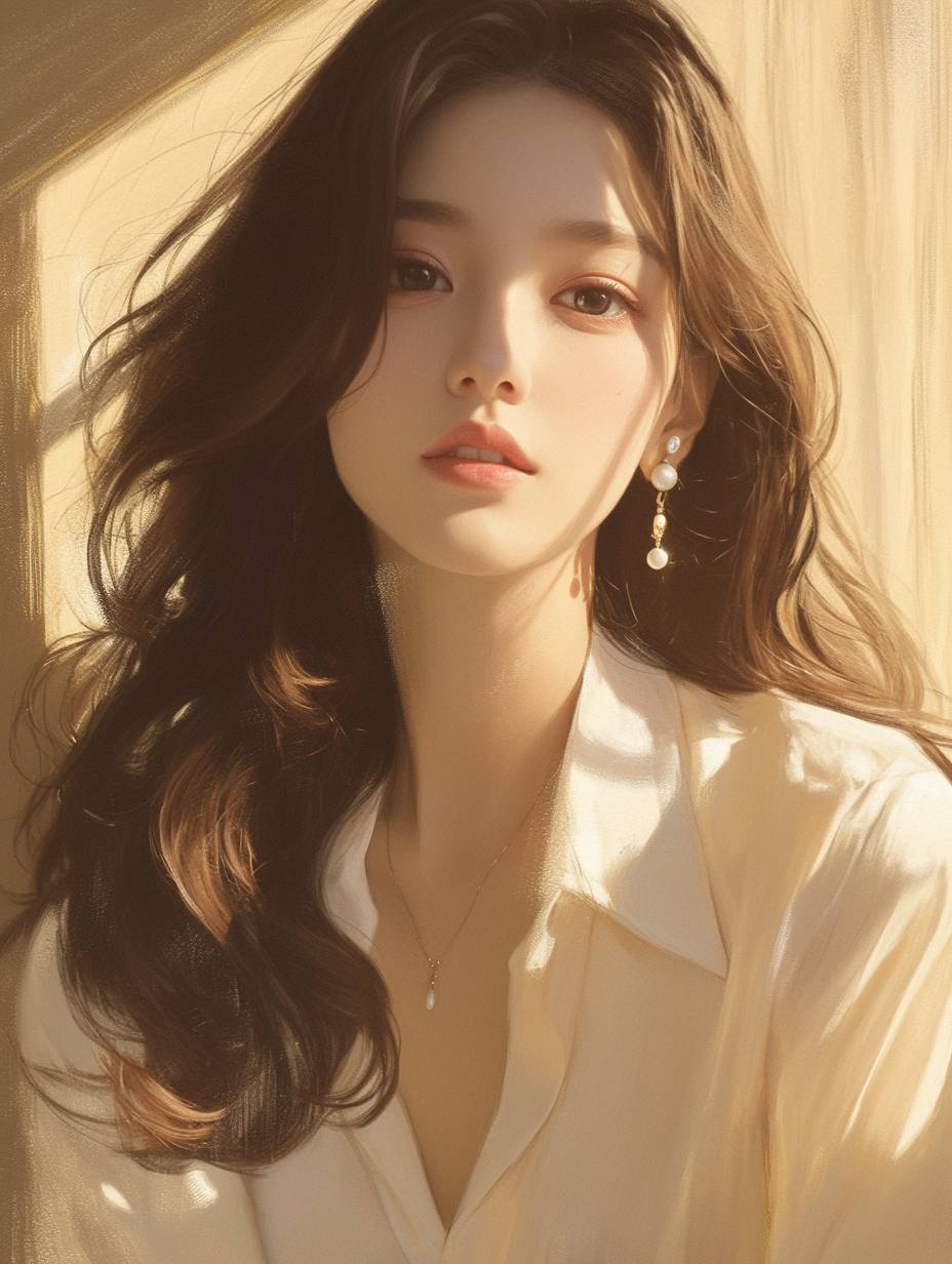 Chinese actress Yang Mi sits by the window, wearing a white leisure suit, delicate tiny white small pearl earrings, fashionable black curly hair, minimalist background creates the style of high definition illustration, Pixar animation and flat illustration. Top illustrator's masterpiece, super fine ultra high definition, delicate features --ar 3:4 --stylize 1000 --niji 6