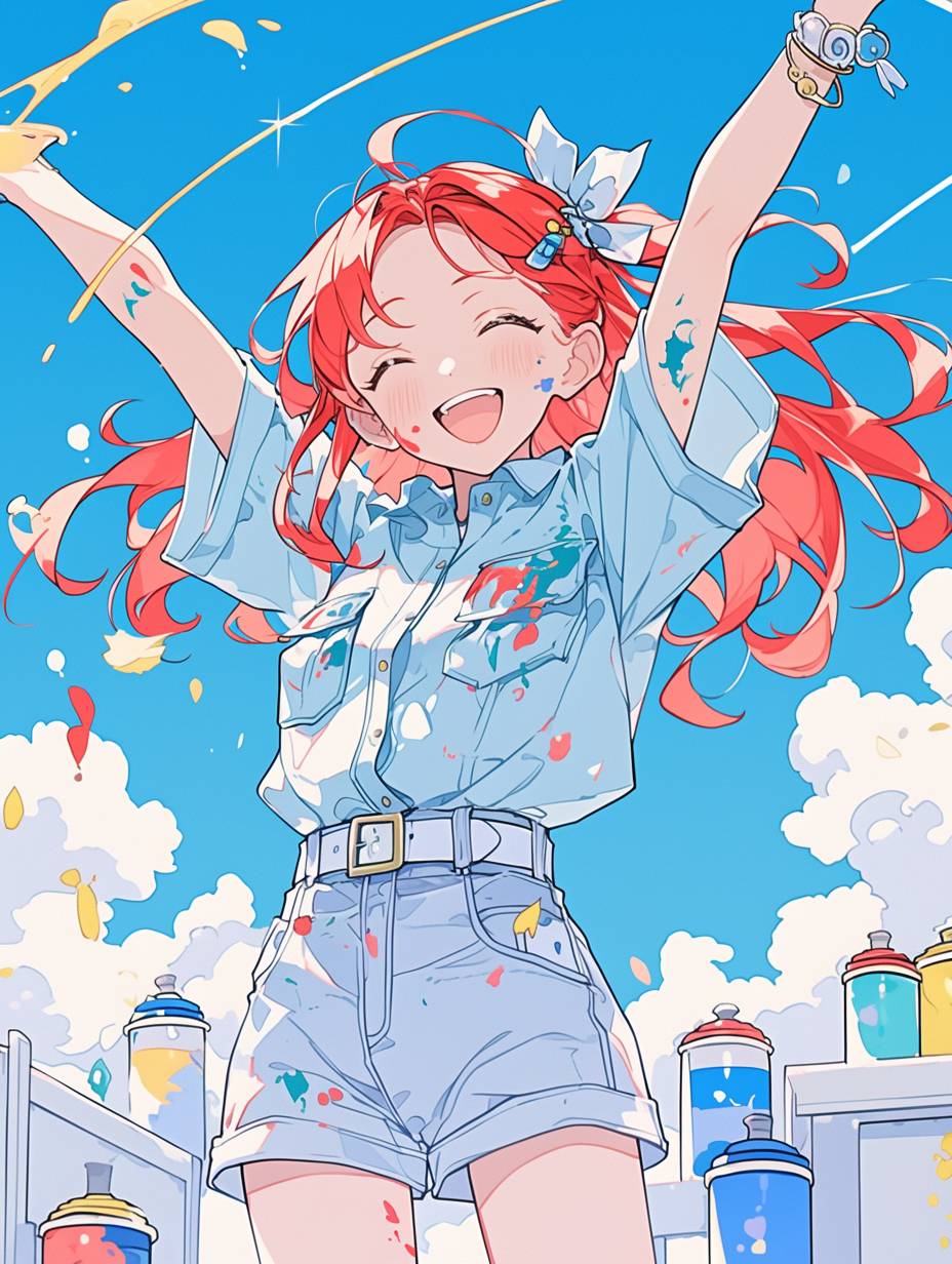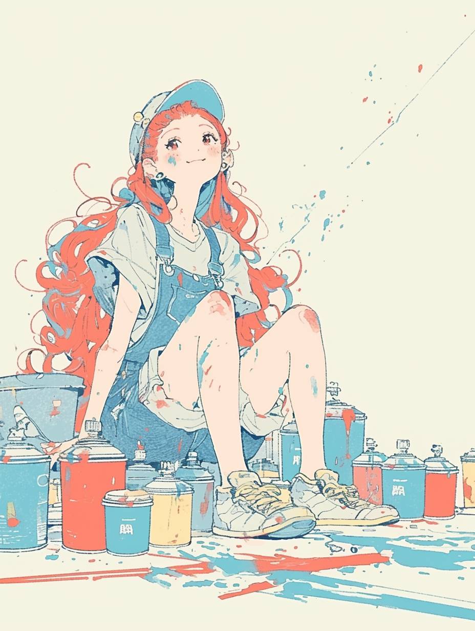 A girl with pop-cute long red hair, wearing a denim tunic outfit, splashing multicolored paint on the wall. Around her are many colorful paint cans and spray cans at her feet. The illustration is full of movement, dynamic and artistic touches, pop and colorful, anime key visual style, and vitamin colors.
