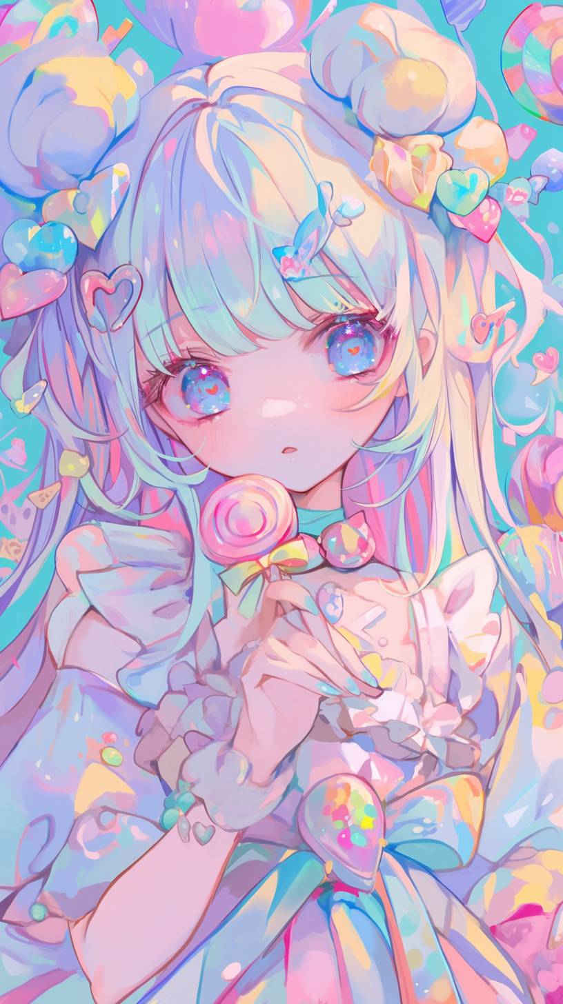 A cute, kawaii anime girl with long hair in pastel colors, wearing an elaborate candy-themed dress and holding colorful candies. The background is filled with various sweets, including pastels, lollipops, and other sweet treats, in the style of Hikari Shimoda. --ar 9:16 --niji 6