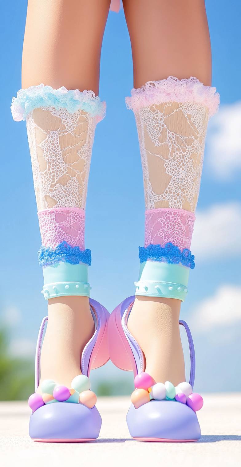 high fashion lace socks and whimsical futuristic Mary Jane’s pumps, neon blue, white, neon pink, neon purple, beige colors, outdoors on a sunny day, blue sky only in the background, long beautiful legs, extreme close up shot, super high end fashion editorial vibe --no trees and no buildings in the background --ar 49:95 --personalize wbjzr65 --stylize 1000 --v 6.1
