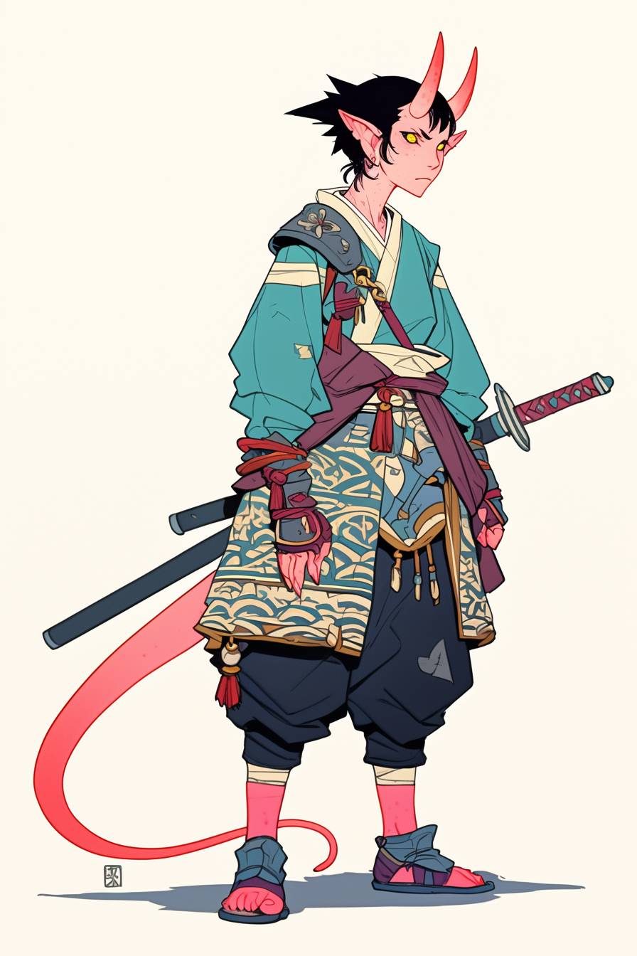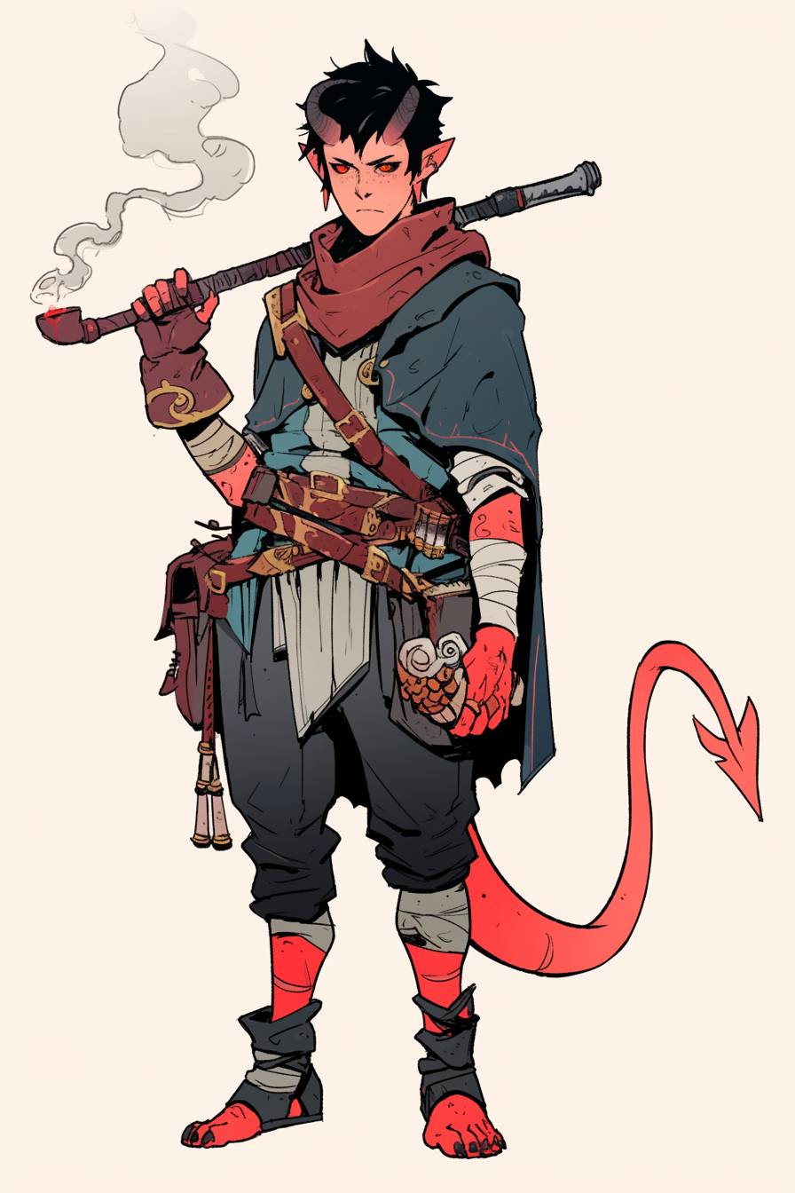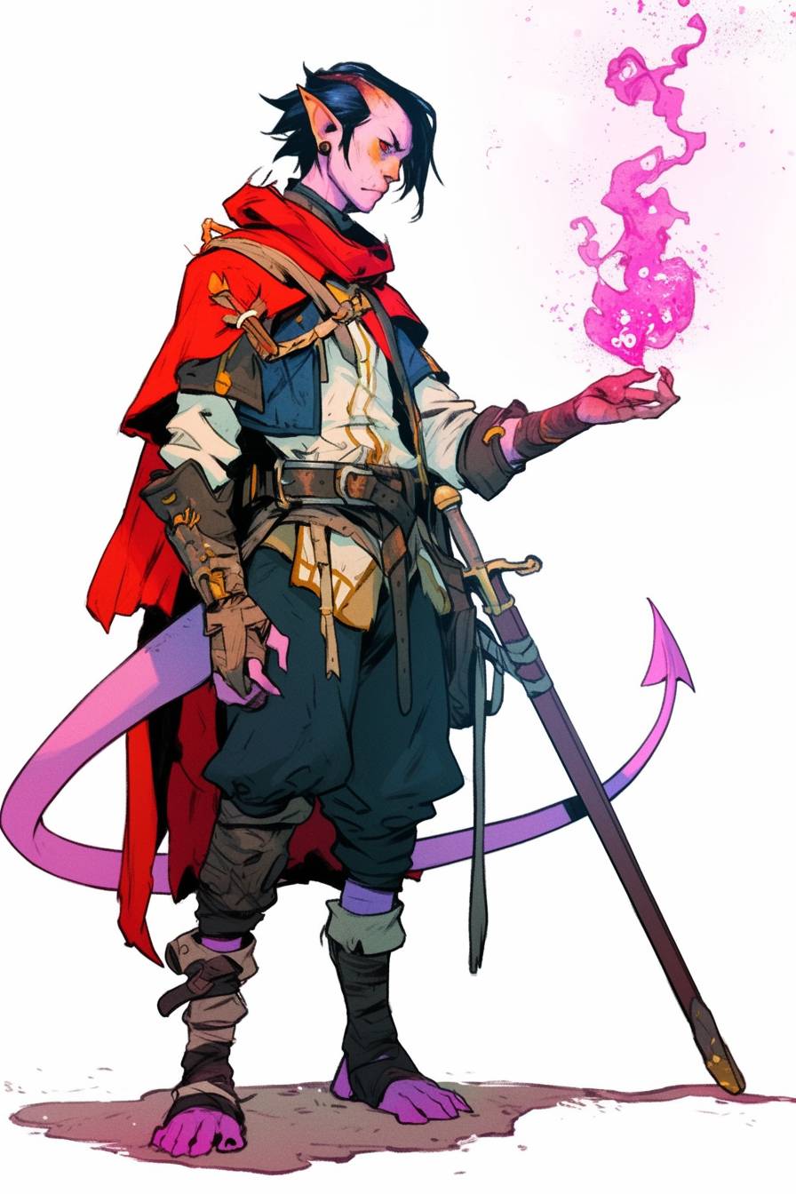 full body shot of an older malnurished dirty skinny tiefling devil sorcerer with pink skin, black hair, red eyes, wearing ragged clothing, dnd character --ar 2:3 --personalize b86iypf --niji 6