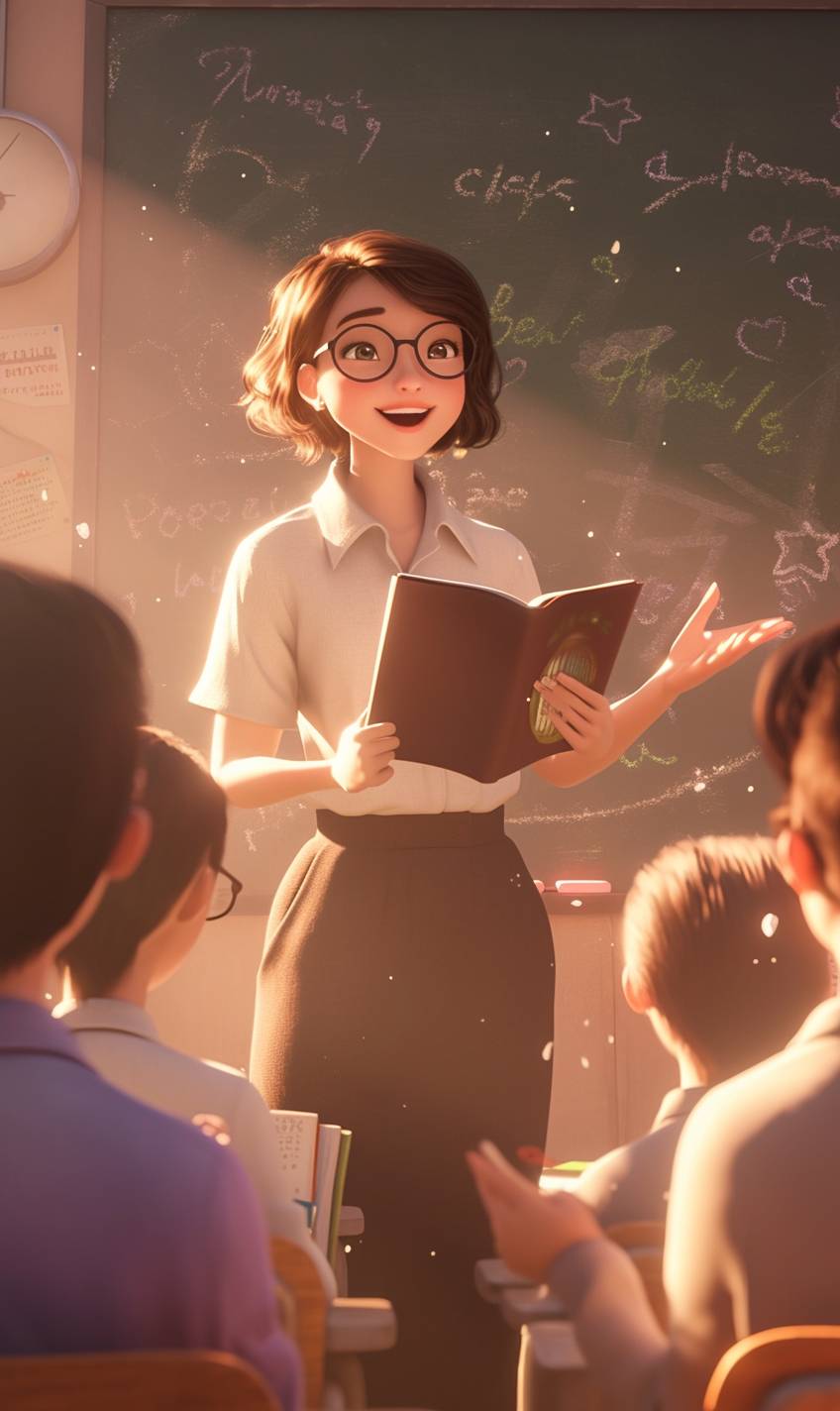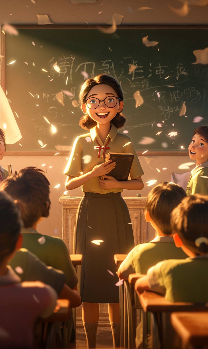 Disney style, 3D character. In the front image, 【a bespectacled Asian female teacher stands in front of the blackboarda】, smiling, holding a book in his hand, surrounded by several middle school students, the sun shining through the window, splashing on the teacher's hair, using pastels, full-length portraits and close-ups. The warm light and bright colors create a sense of hope and joy. Animation aesthetic style, with Chinese modernist art design style, with romantic soft focus and ethereal light style, warm atmosphere, film composition, 3d artwork, natural light, background focal length of 35mm f1.4, C4D, blender, octan rendering, high detail 8k. --ar 3:5 --style raw --stylize 700 --niji 6