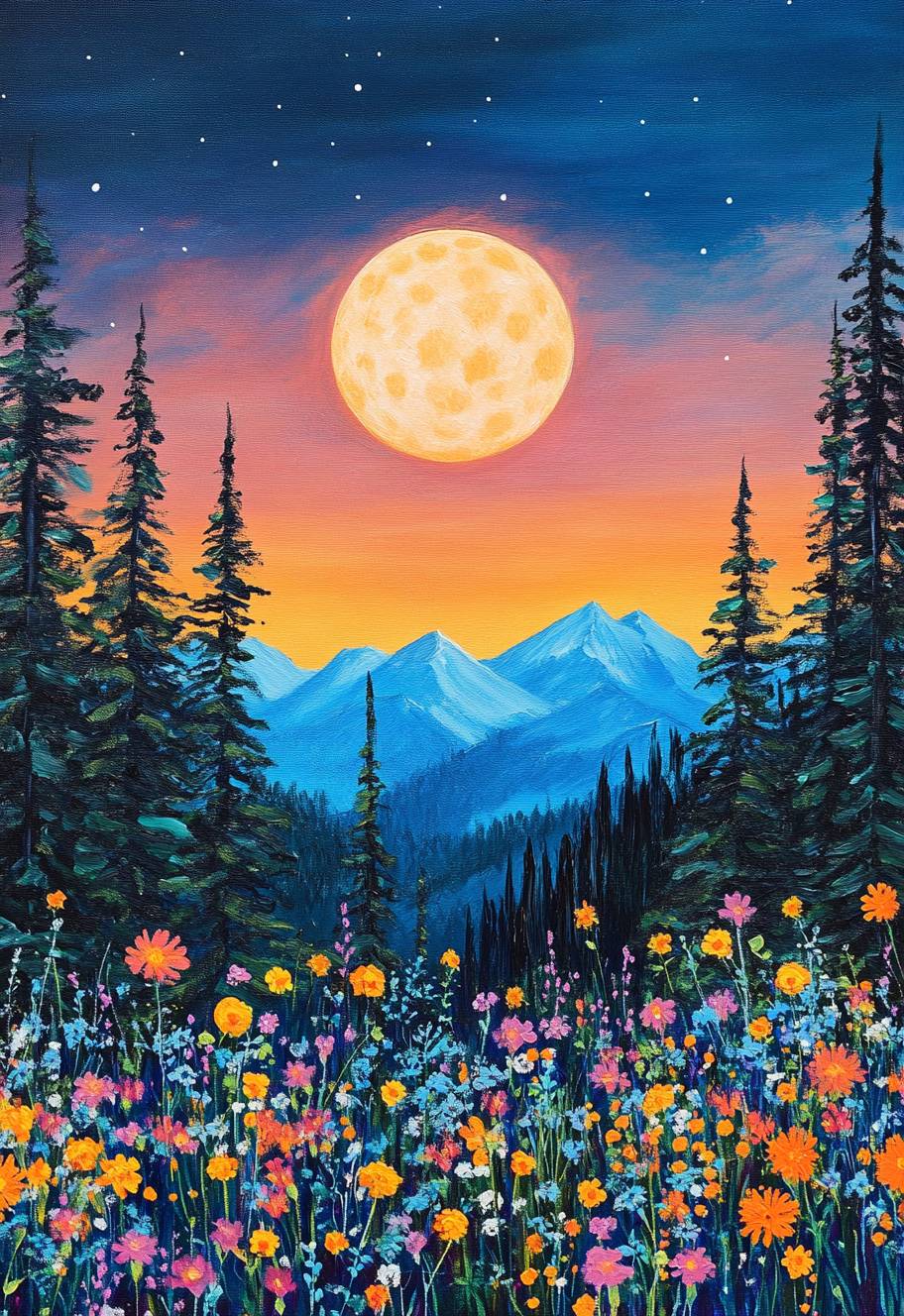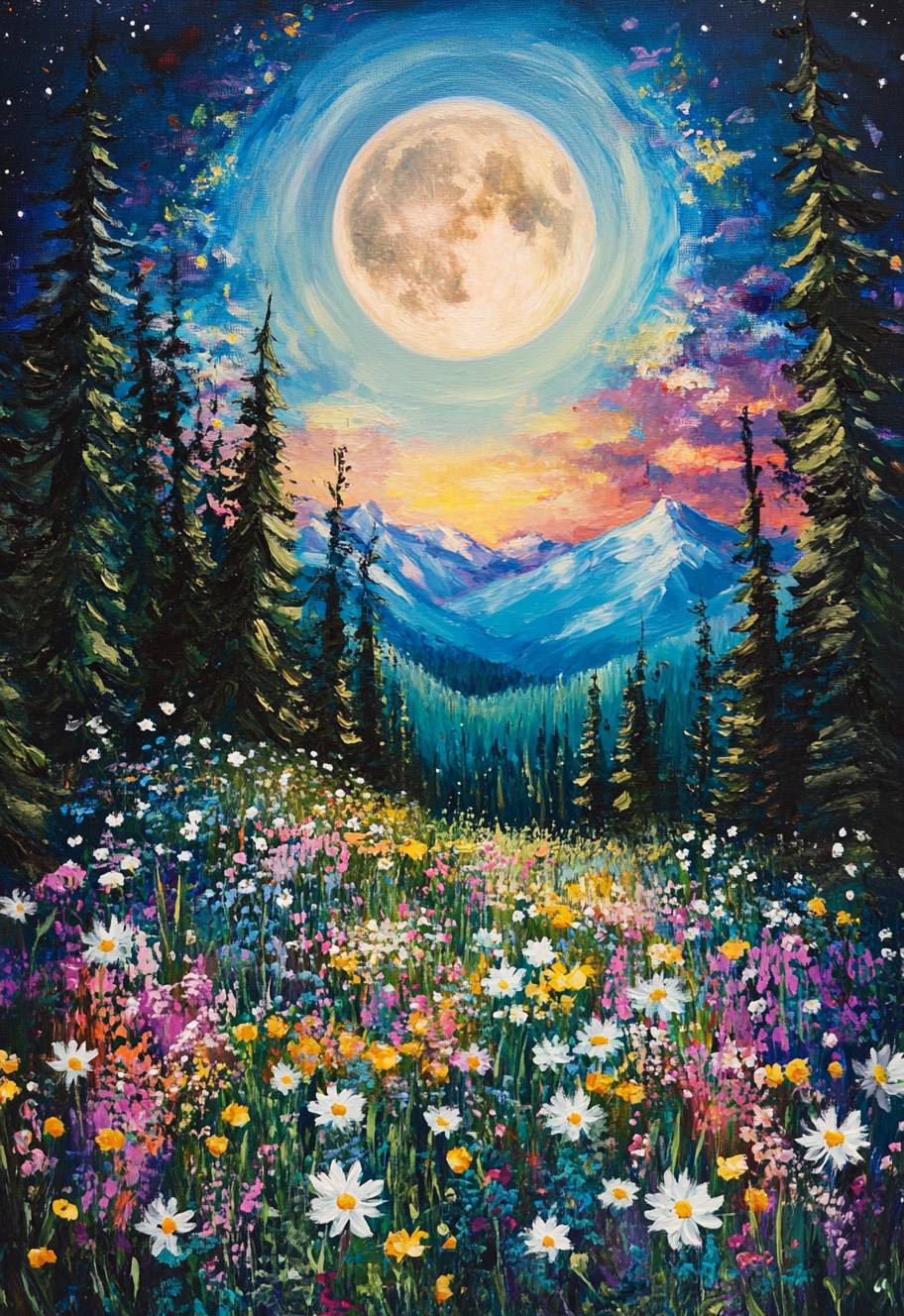 A vibrant acrylic painting of the full moon shining over an alpine meadow, surrounded by tall pine trees and wildflowers in bloom. The colors blend harmoniously with the night sky, creating a dreamy atmosphere.