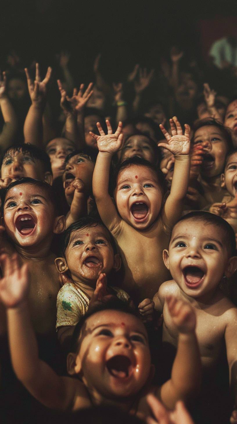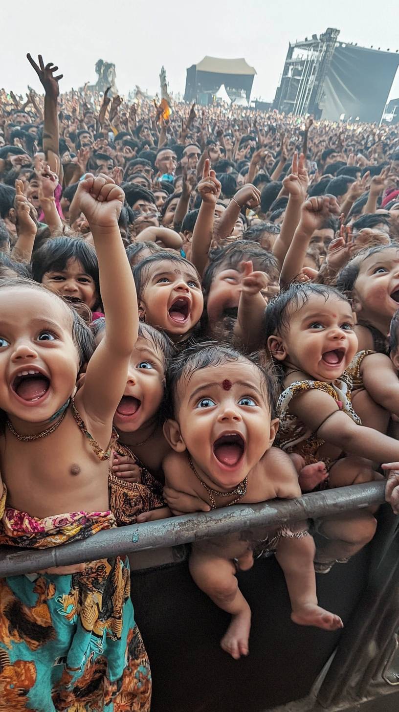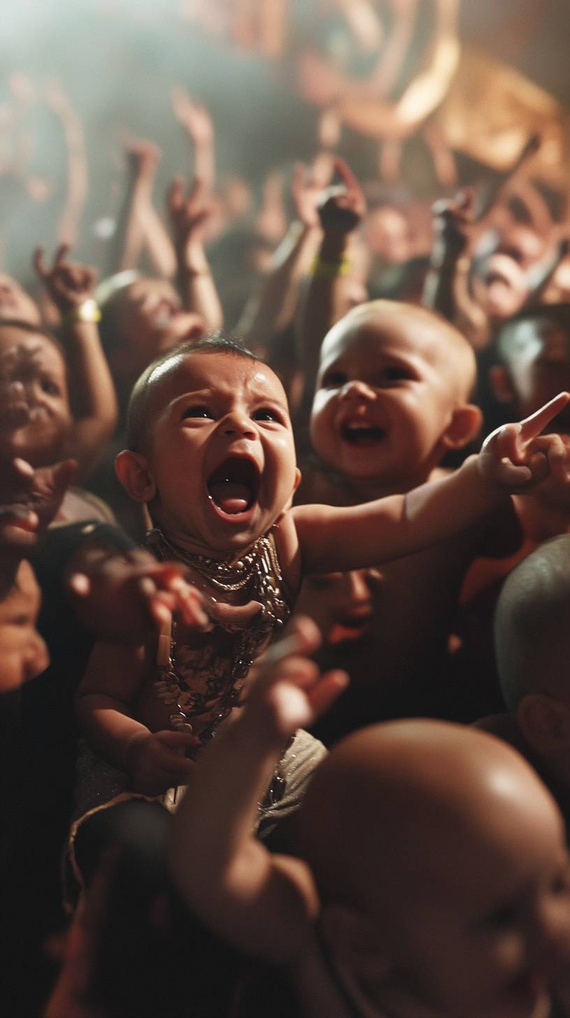 a realistic photo of an Indian heavy metal concert audience full of babies between 2 and 3 years old, both male and female, having the best time of their lives, --ar 9:16 --stylize 50 --v 6.1