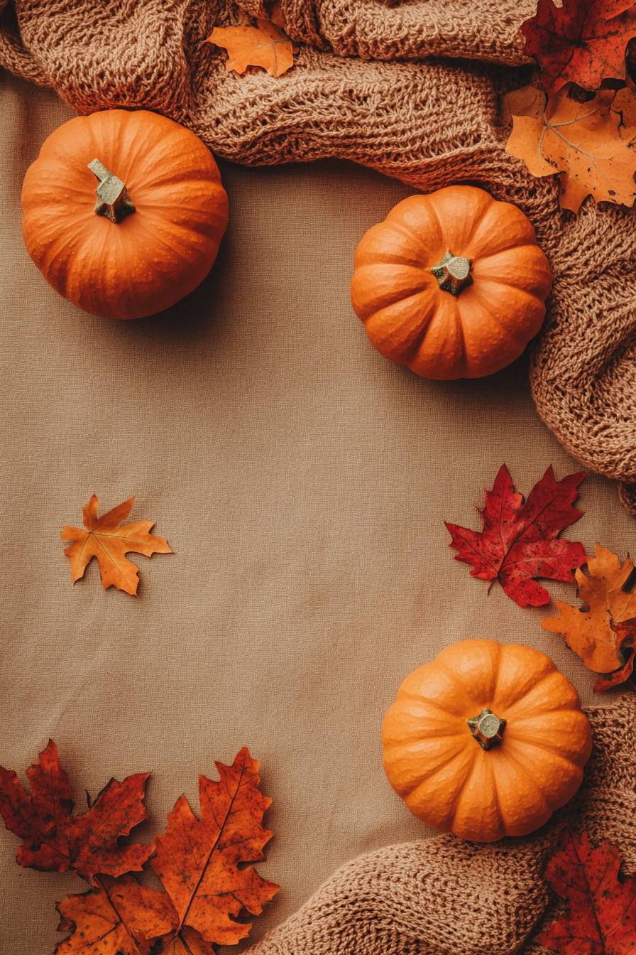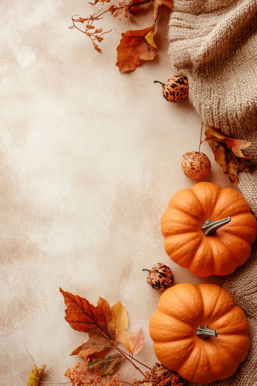 A flat-lay arrangement on a fall-inspired background. Use fall elements like some leaves, two orange pumpkins, knitted fabric on one corner and a lot of empty space in between to evoke a warm, seasonal feel, soft brown clean background with some glitter on the surface, elegant.